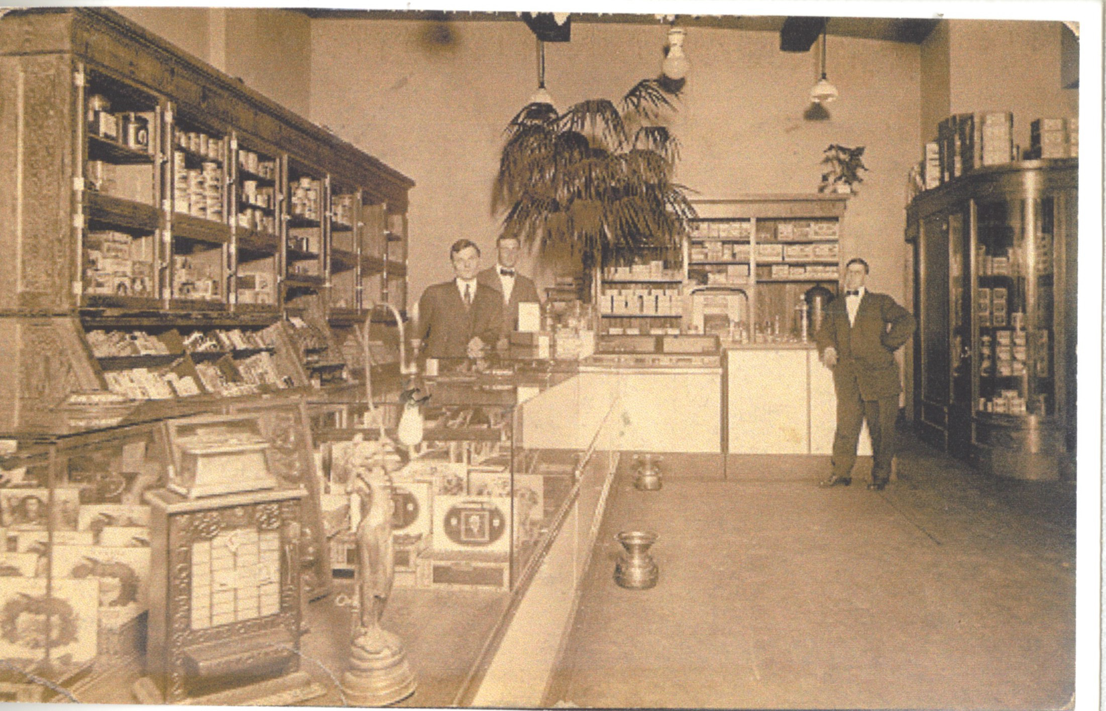 - Sepia toned photo image of cigar shop interior with merchandise and three men