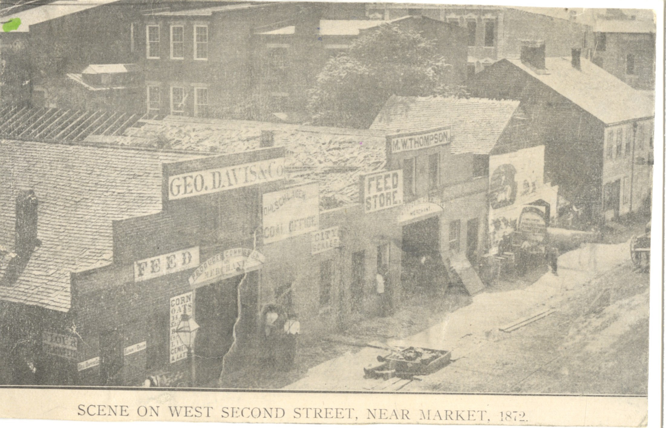 - Black and white photo image of West Second (2nd) Street near Market Street. The first building on the left was George Davis & Company Feed Store which sold corn, oats, and hay. Next to this building was the Oehlschlager Coal Office which held the city scales and the Ohio Farmers office. The agent was W. H. Bonsall. The building next to this was Mathew W. Thompson & Son Feed Store, a commission merchant.