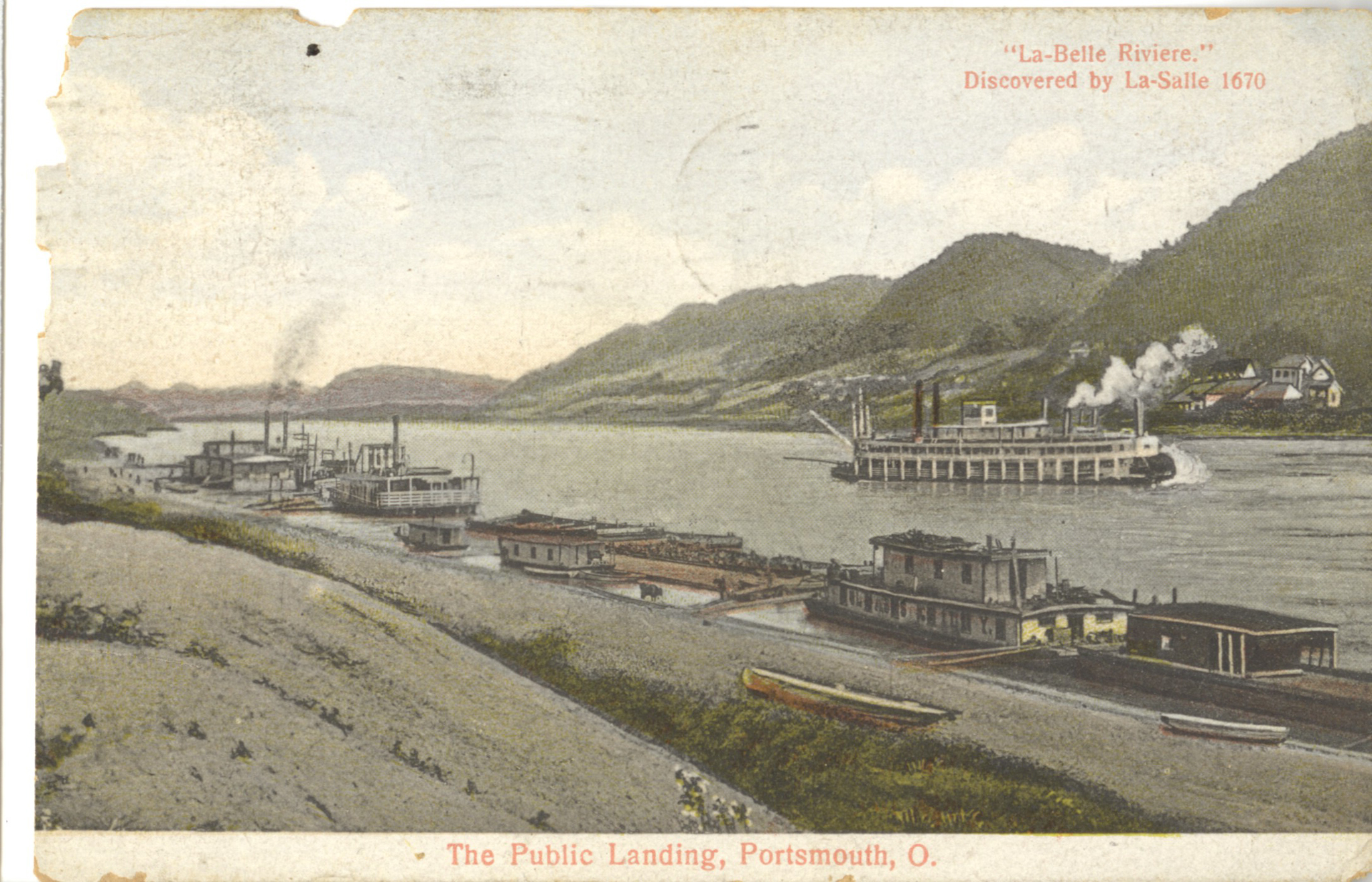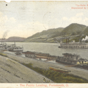 - Colorized image of the public landing docks along the Ohio River in Portsmouth. Various riverboats are docked along the bank.