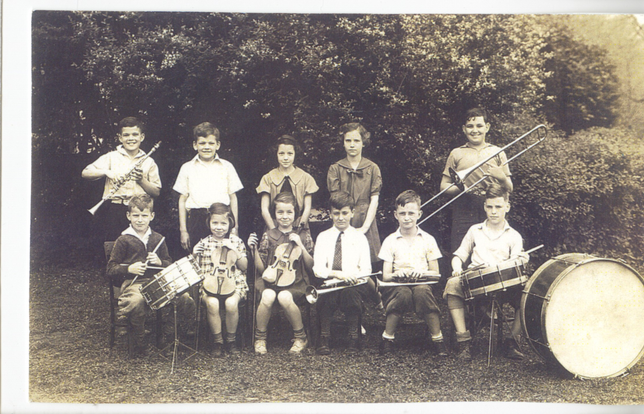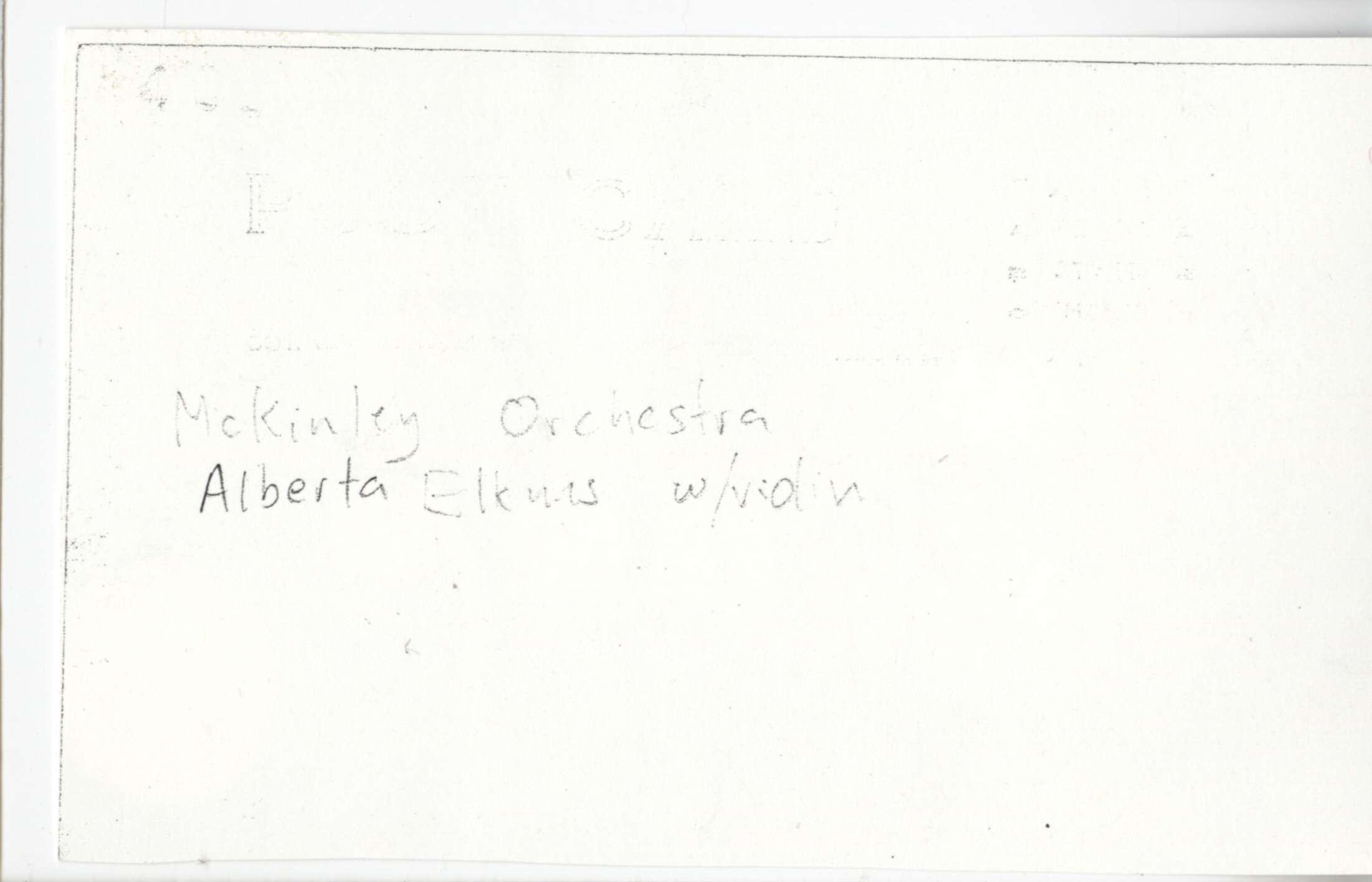 - Black and white photo image of a group of unknown children with instruments in what looks like a school band at the McKinley School. On the back: McKinley Orchestra. Alberta Elkuns