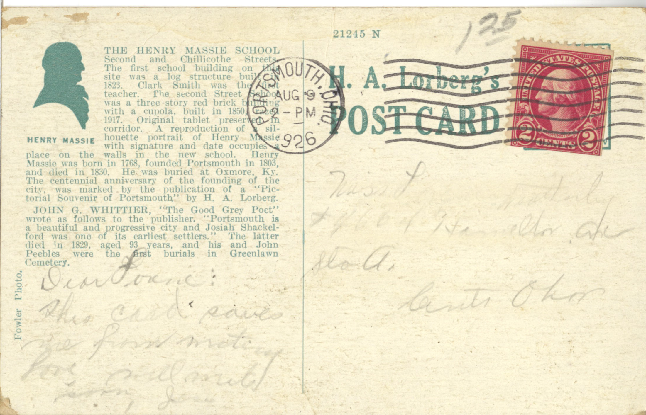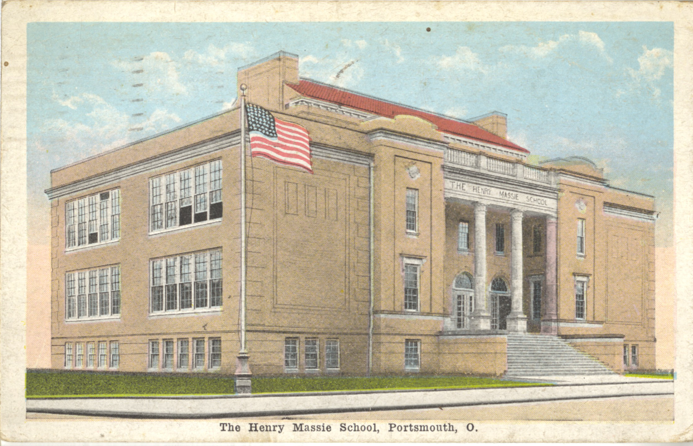 - Colorized image of the Henry Massie School building on the southwest corner of Second (2nd) & Chillicothe Streets. It was opened in 1918 and closed in 1958. It was re-named Griffin Hall for use by the Ohio University Portsmouth Branch from 1961 to 1967. It was razed in 2003.