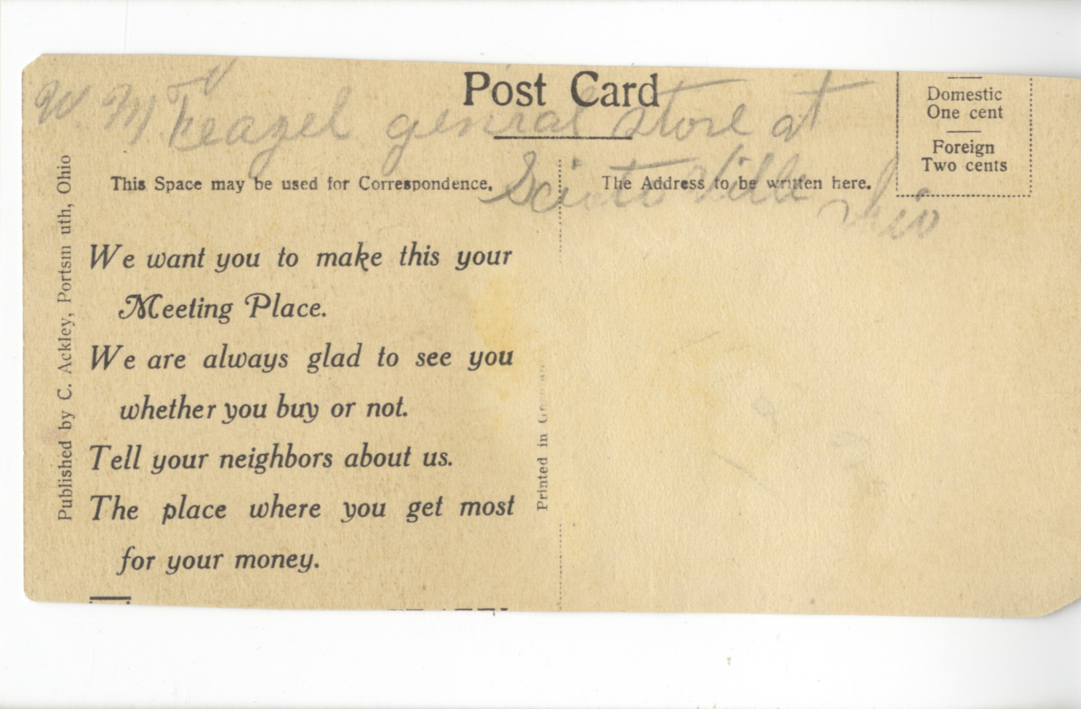 Published by C. Ackley , “Wm Feazel General Merchant,” Scioto County Public Library Local History Digital Collection, accessed December 13, 2025, https://www.sciotolibrary.org/history/items/show/17994.