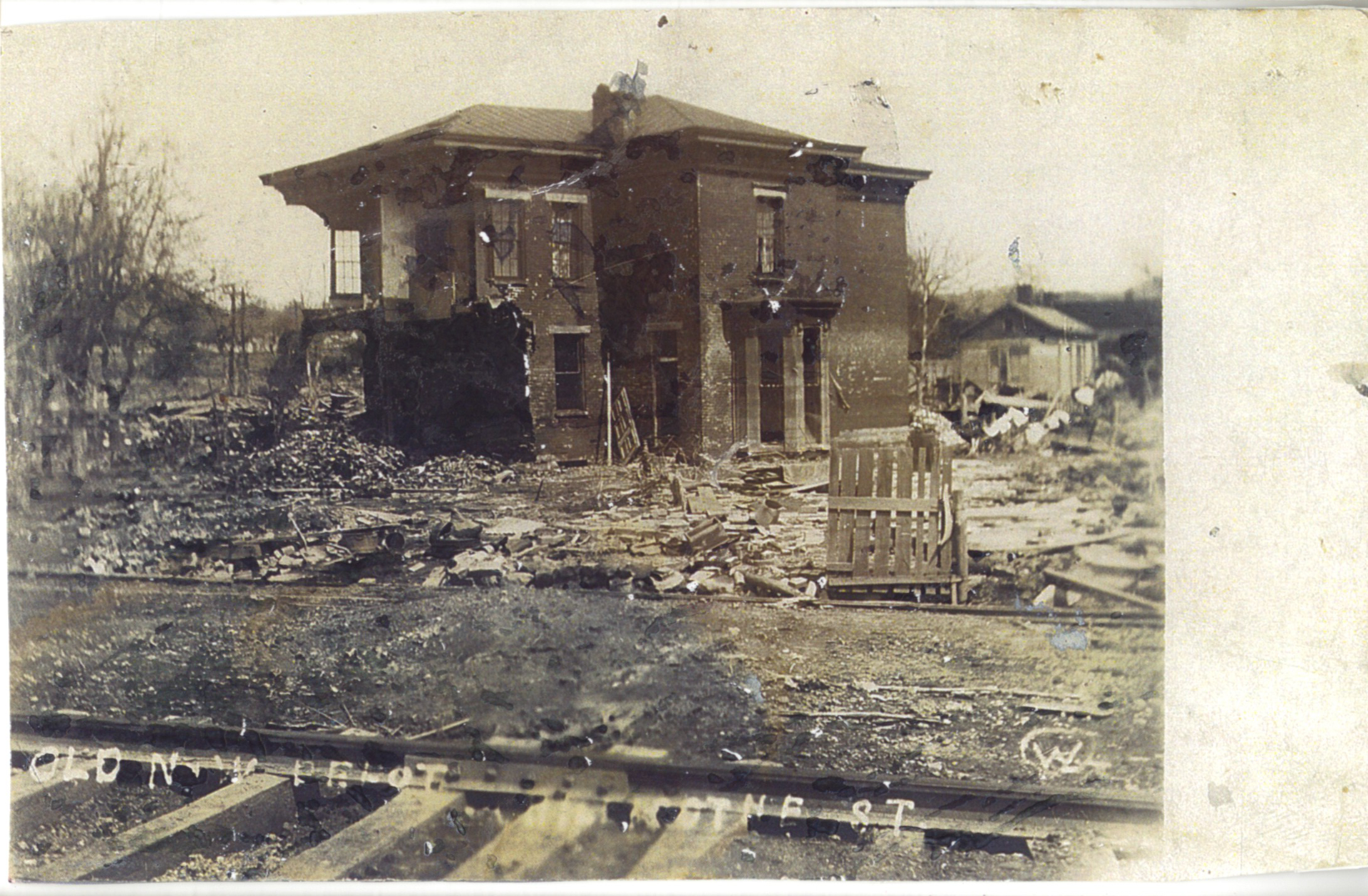 - Black and white photograph of the old Scioto Valley depot on Chillicothe Street after the flood of March 1913.