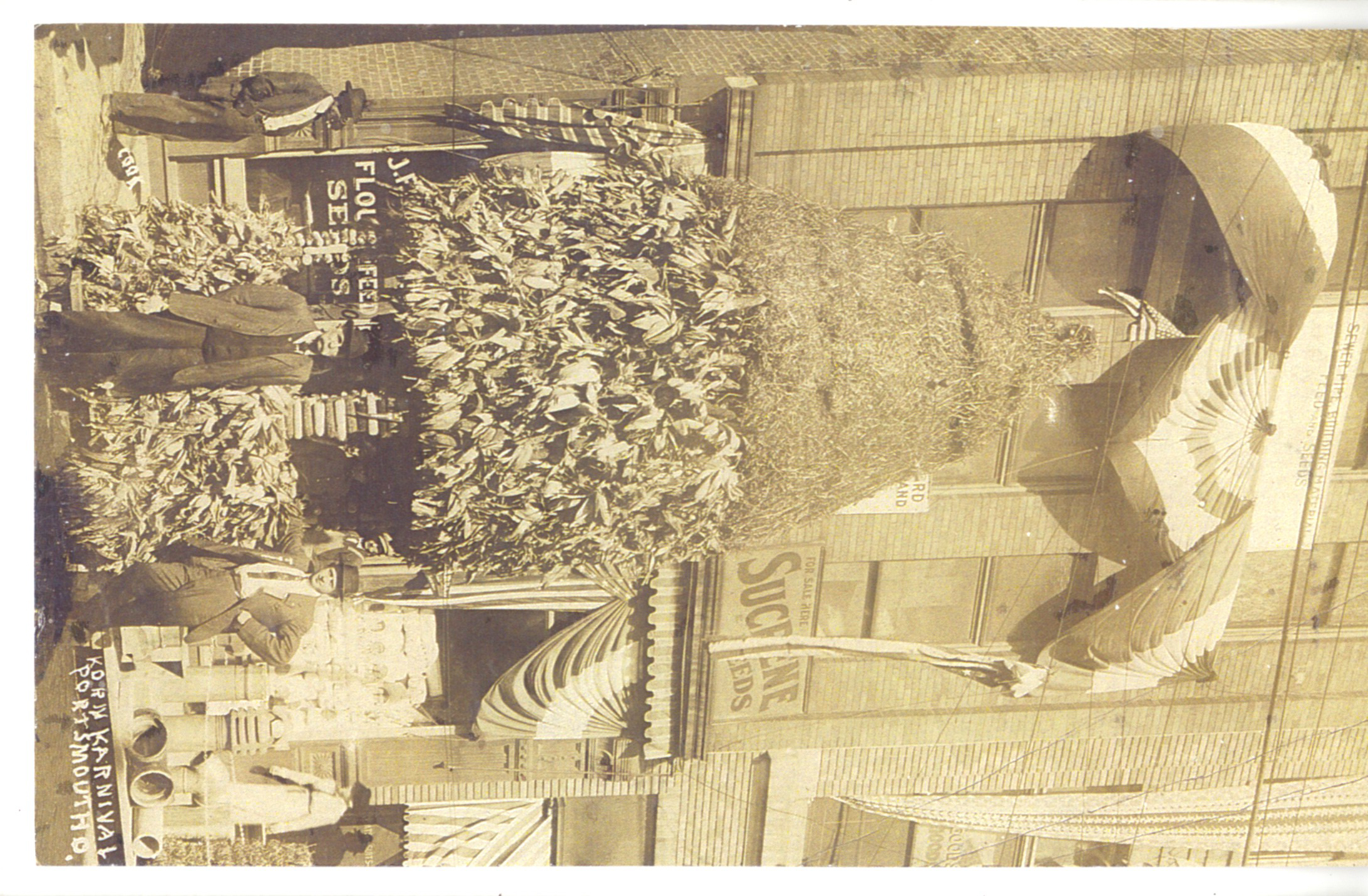 - Sepia tone photograph image of two gentlemen standing in front of a corn display and brick business. Back of postcard inscribed "907 Gallia, F. D. Newman & Son." The Korn Karnival was a predecessor to River Days. It was held in the Fall and lasted from 1913 to 1917 wjen it was suspended due to World Was I. A parade was held every evening and booths were set up along Chillicothe Street.