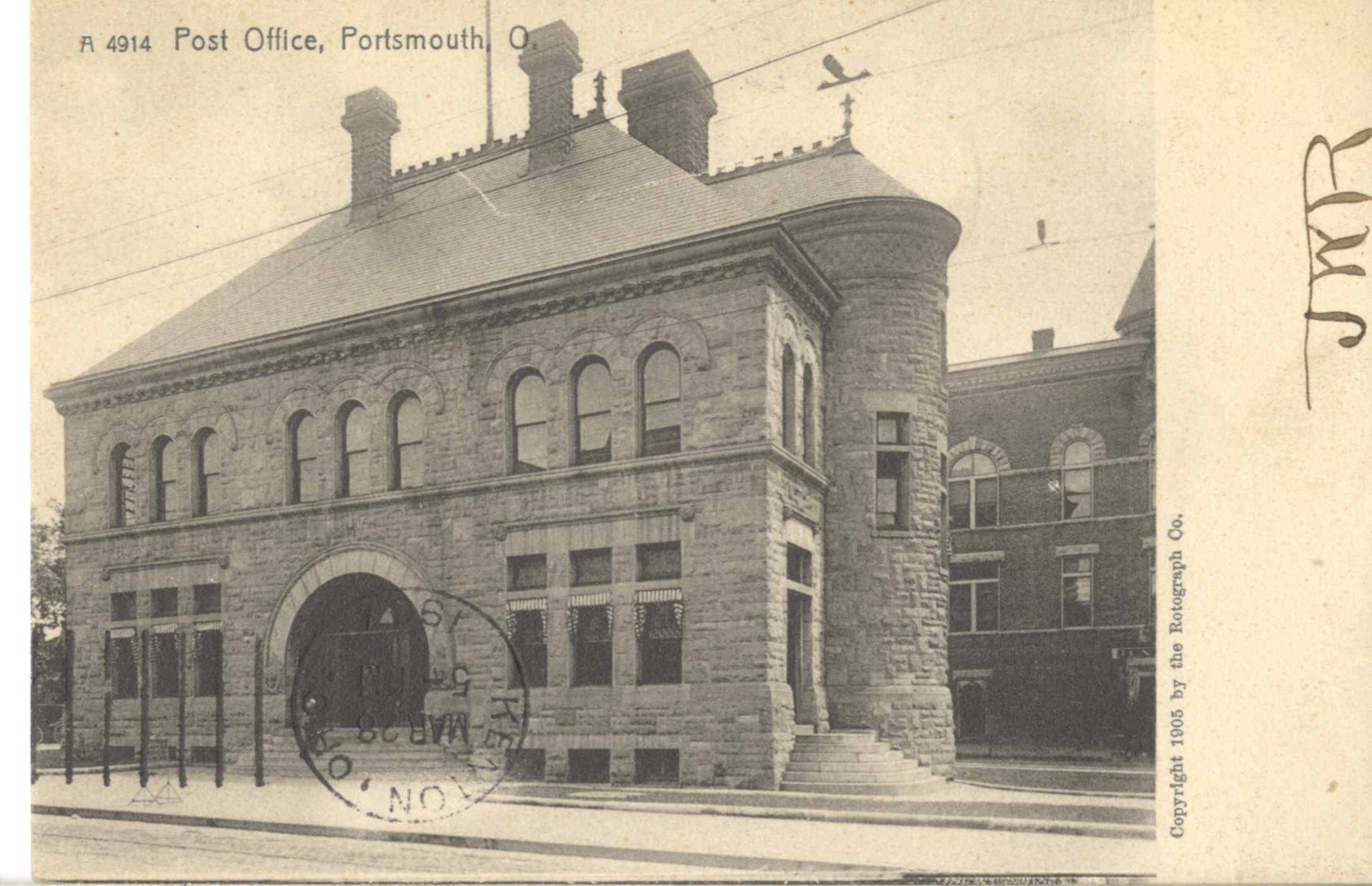 Rotograph Co., “Post Office, Portsmouth, O.,” Scioto County Public Library Local History Digital Collection, accessed December 13, 2025, https://www.sciotolibrary.org/history/items/show/18114.