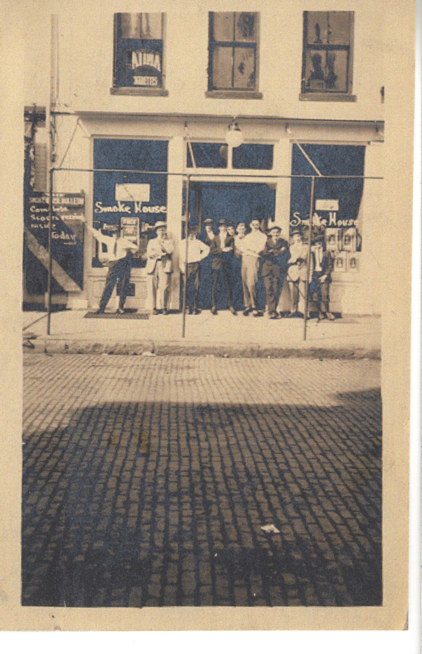 - Sepia photo image of unknown individuals in front of the Smoke House. The building was located at 503 Chillicothe Street. The business manufactured and sold cigarettes.