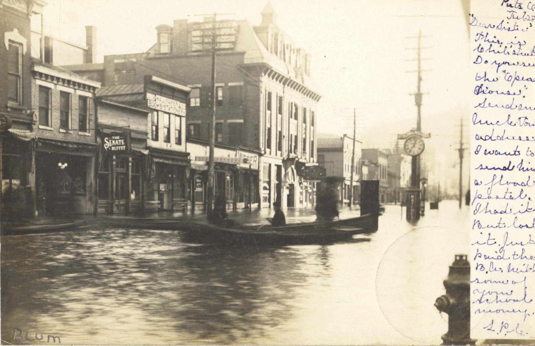 - Black and white photo image of Chillicothe Street during the 1907 flood in Portsmouth. Pictured are unknown individuals in boats traversing the waters. The Senate Buffet and Weber, a shoe store located at 408 Chillicothe Street can be seen as well as a stationery store.