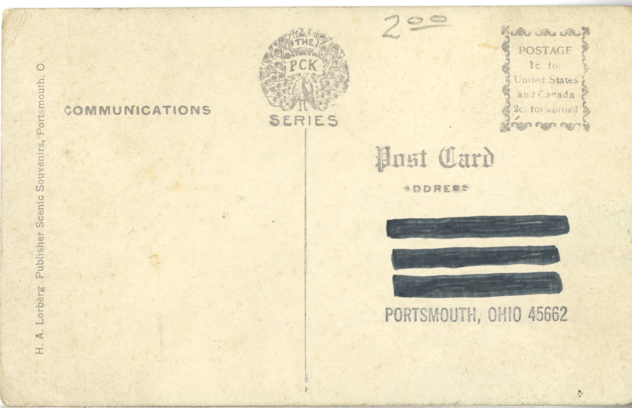 H.A.Lorberg publisher, Scenic Souvenirs, Portsmouth, O., “On Kinney's Lane, Portsmouth, Ohio,” Scioto County Public Library Local History Digital Collection, accessed December 13, 2025, https://www.sciotolibrary.org/history/items/show/18198.