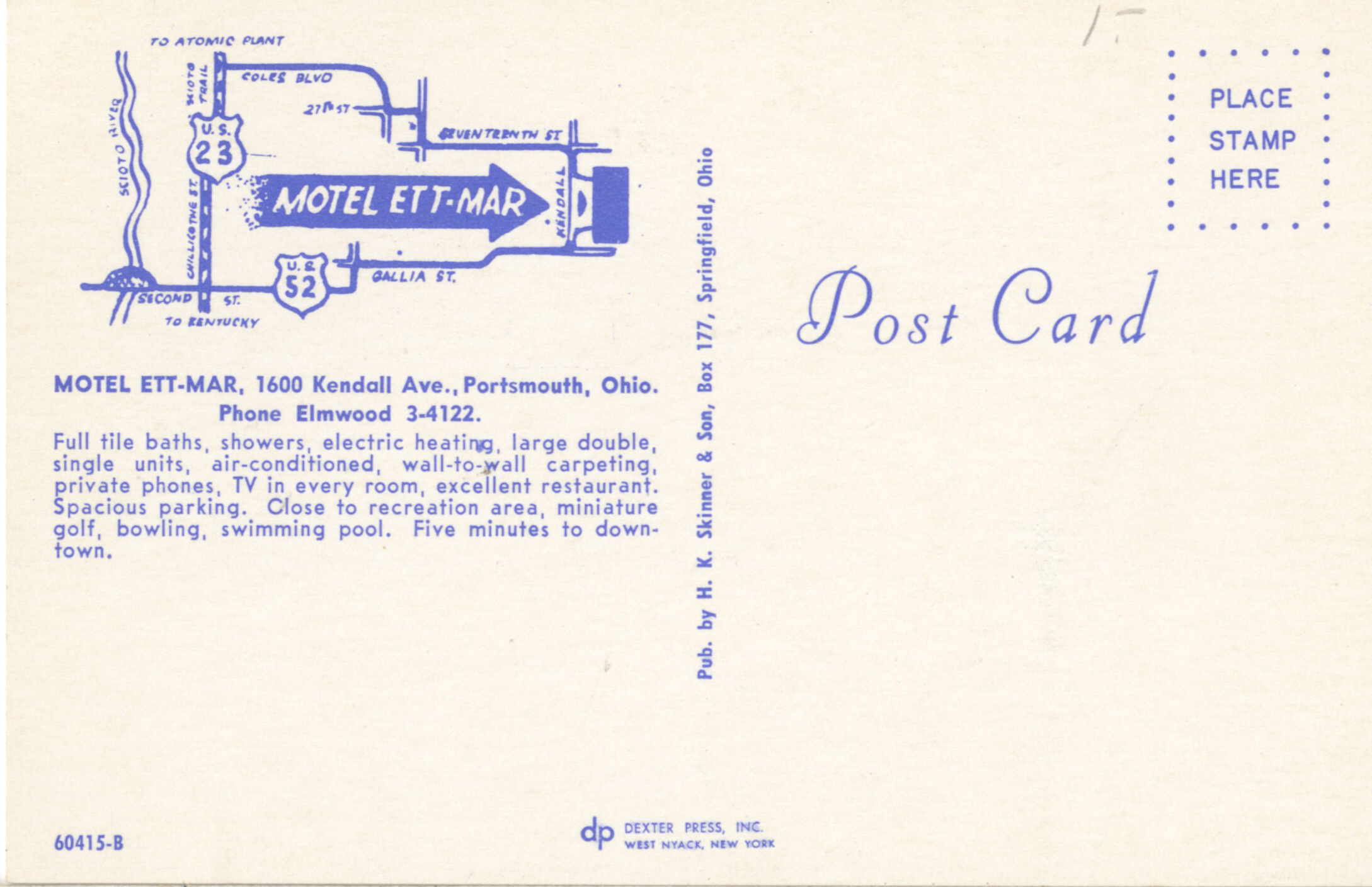 Published by H. K. Skinner & Son, Springfield, Ohio, “Motel ETT MAR,” Scioto County Public Library Local History Digital Collection, accessed December 13, 2025, https://www.sciotolibrary.org/history/items/show/18224.