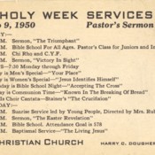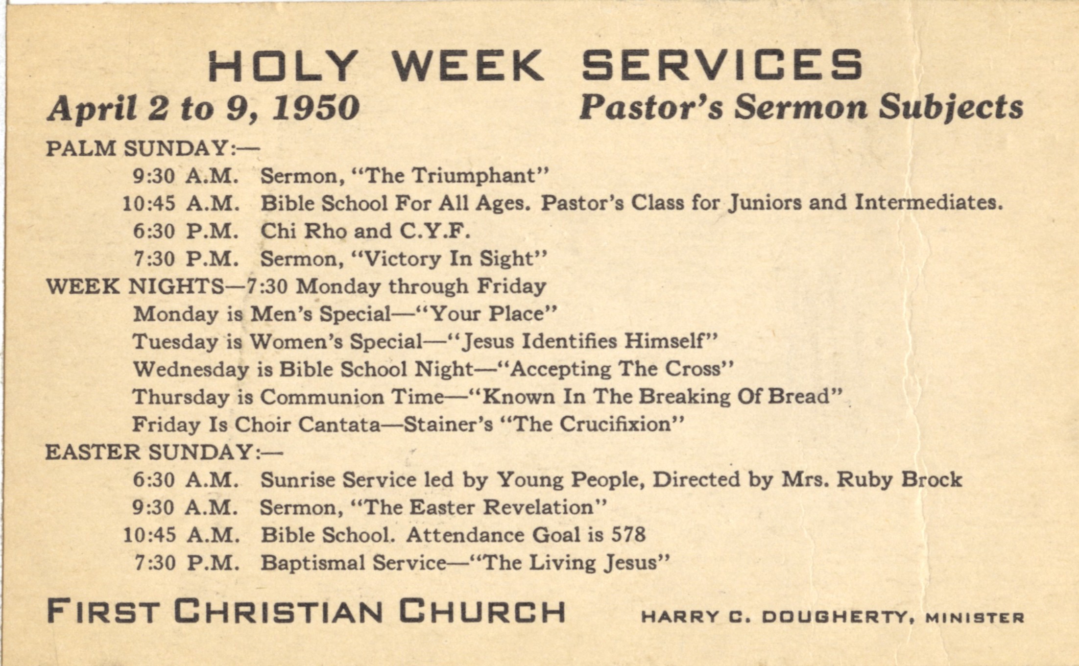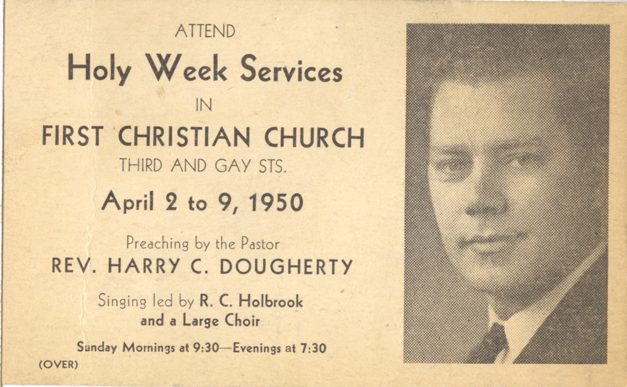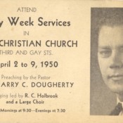 - Black & white invitation to Holy Week Services, First Christian Church, Third (3rd) and Gay Streets, April 2 to 9, 1950, Harry C. Dougherty, minister