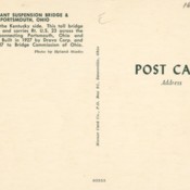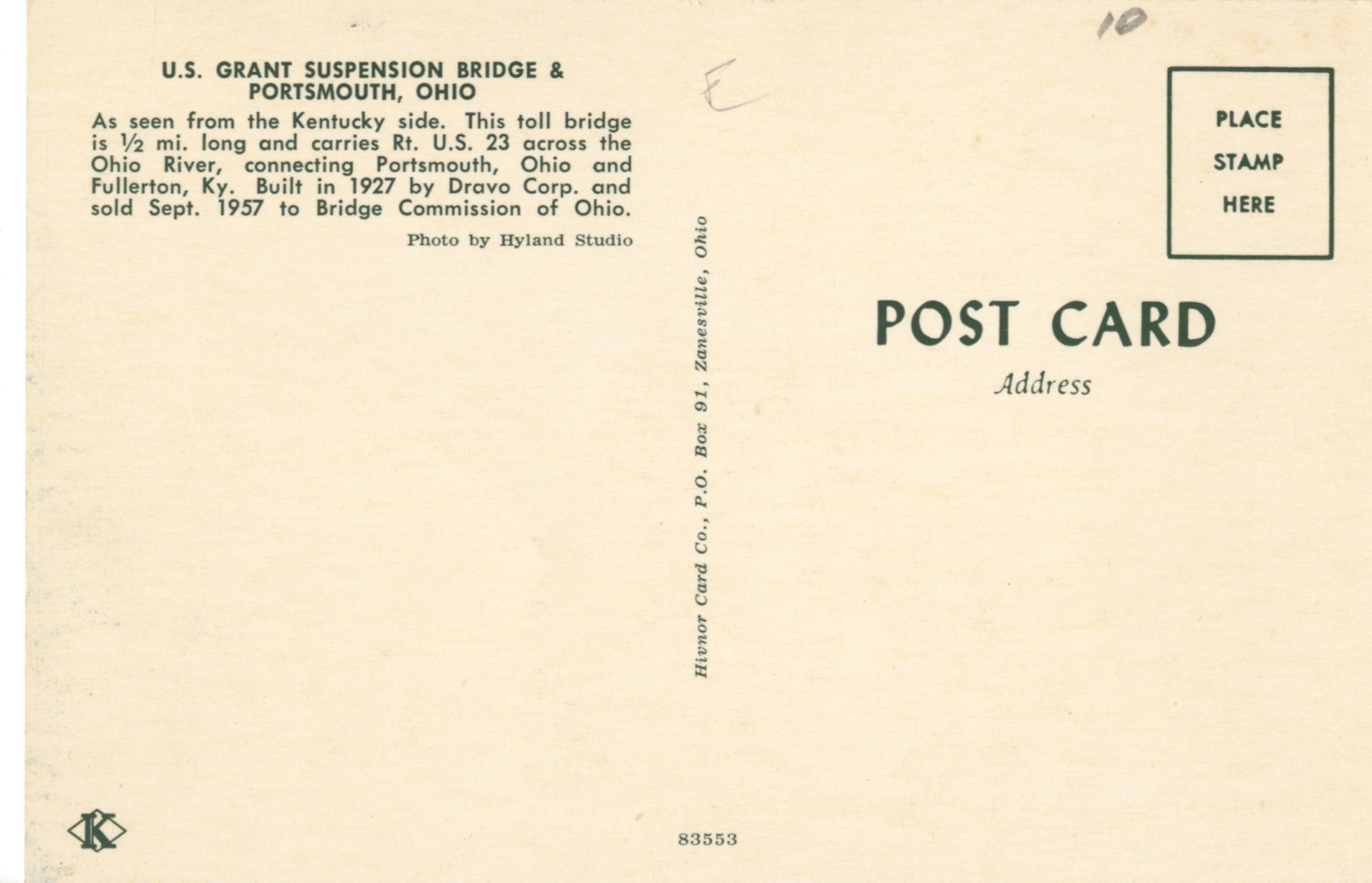 Hivnor Card Company, Zanesville, Ohio, “U. S. Grant Suspension Bridge,” Scioto County Public Library Local History Digital Collection, accessed December 14, 2025, https://www.sciotolibrary.org/history/items/show/18507.