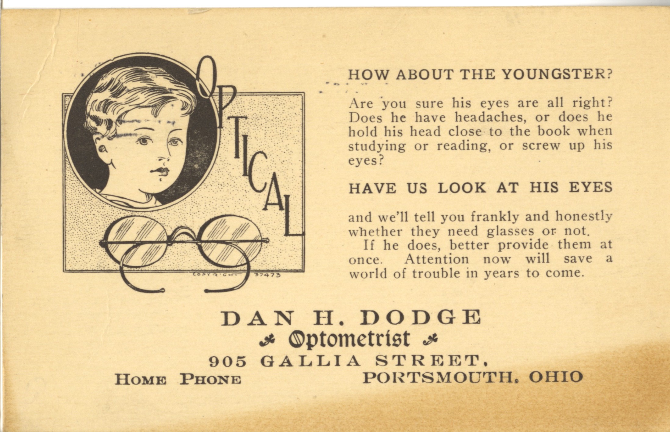 Unknown, “Dan H. Dodge, Optometrist,” Scioto County Public Library Local History Digital Collection, accessed December 5, 2025, https://www.sciotolibrary.org/history/items/show/18593.