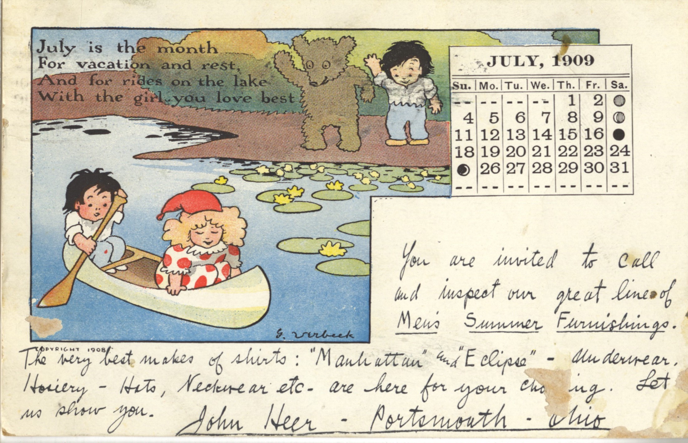 - Colored drawing of canoe scene, July calendar, and written notes of merchandise on sale. John Heer sold clothing, hats and gents furnishings at his business in the Masonic Temple Building at the northwest corner of Chillicothe and Fourth (4th) Streets.