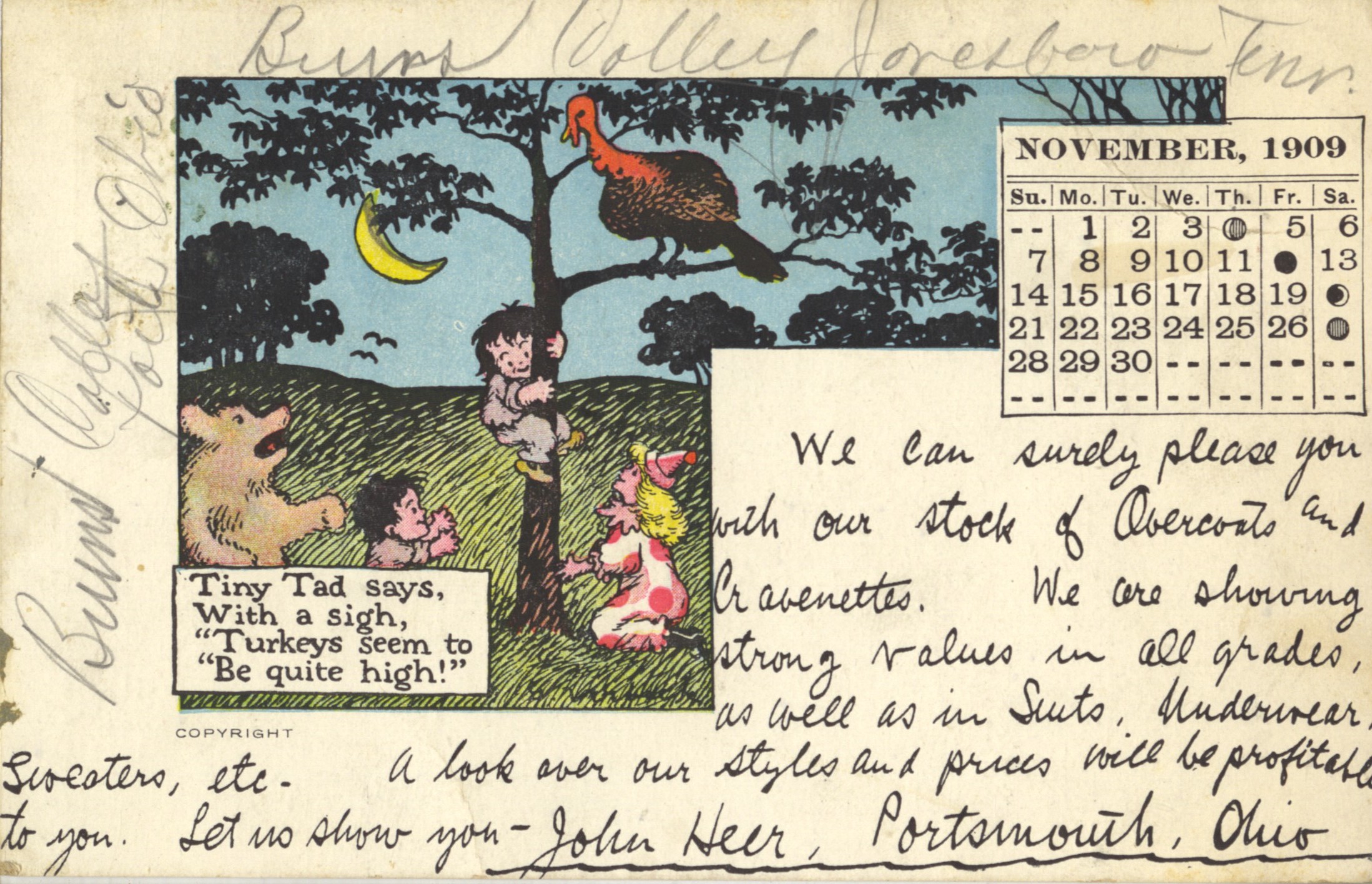- Colored drawing of children and animals, November calendar, and written notes of merchandise on sale. John Heer sold clothing, hats and gents furnishings at his business in the Masonic Temple Building at the northwest corner of Chillicothe and Fourth (4th) Streets.