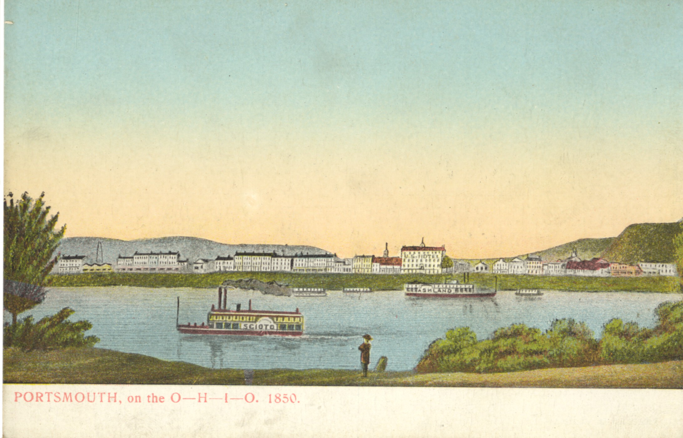 - Colorized image of Portsmouth situated along the Ohio River with steamboats traveling along the waters. The steamboat on the left is called the Scioto, and the one on the right is the Ashland. The U. S. Hotel can be made out in the background.