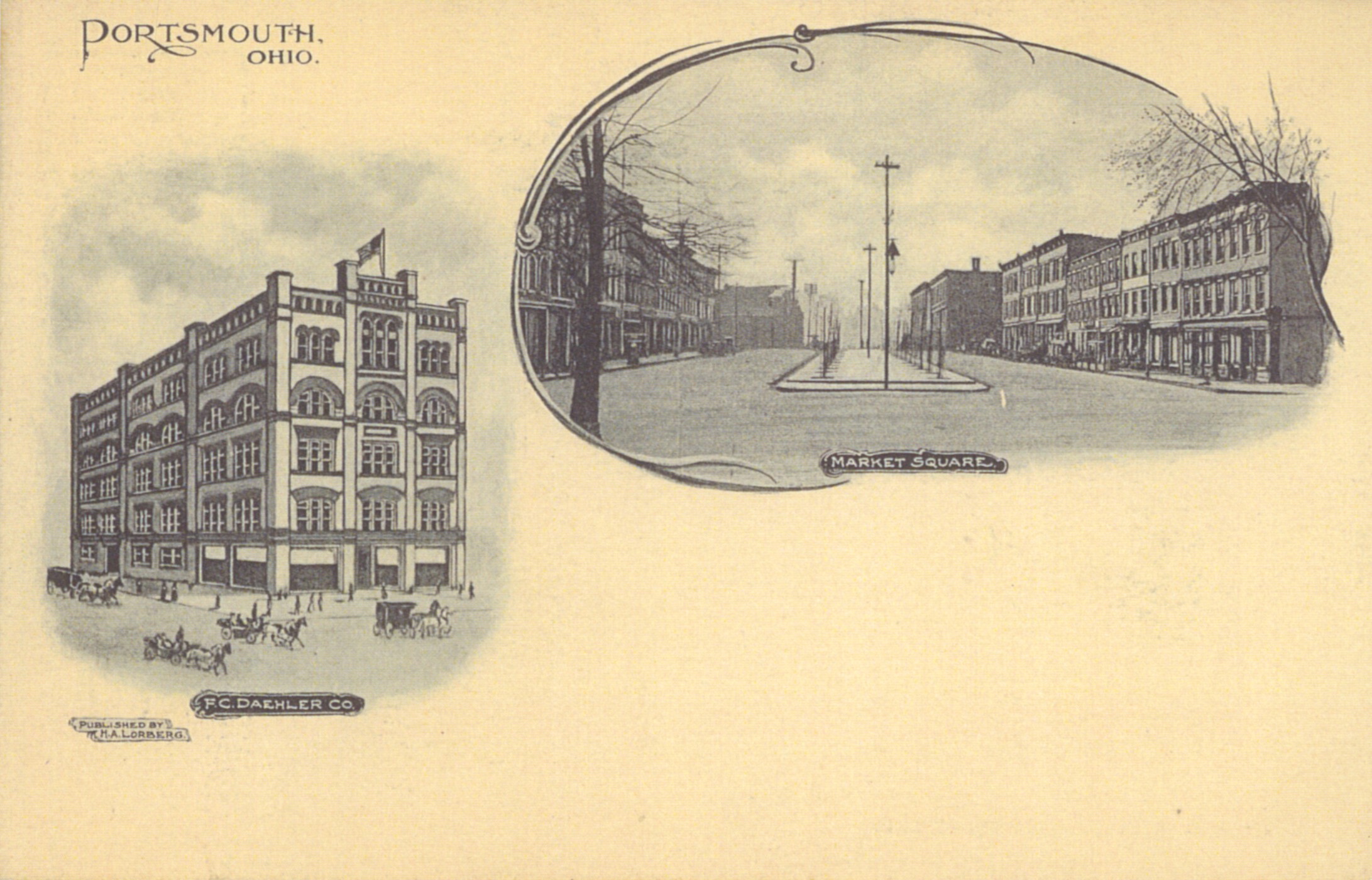 H. A. Lorberg, publisher , “Market Square and F. C. Daehler & Co.,” Scioto County Public Library Local History Digital Collection, accessed December 5, 2025, https://www.sciotolibrary.org/history/items/show/18653.