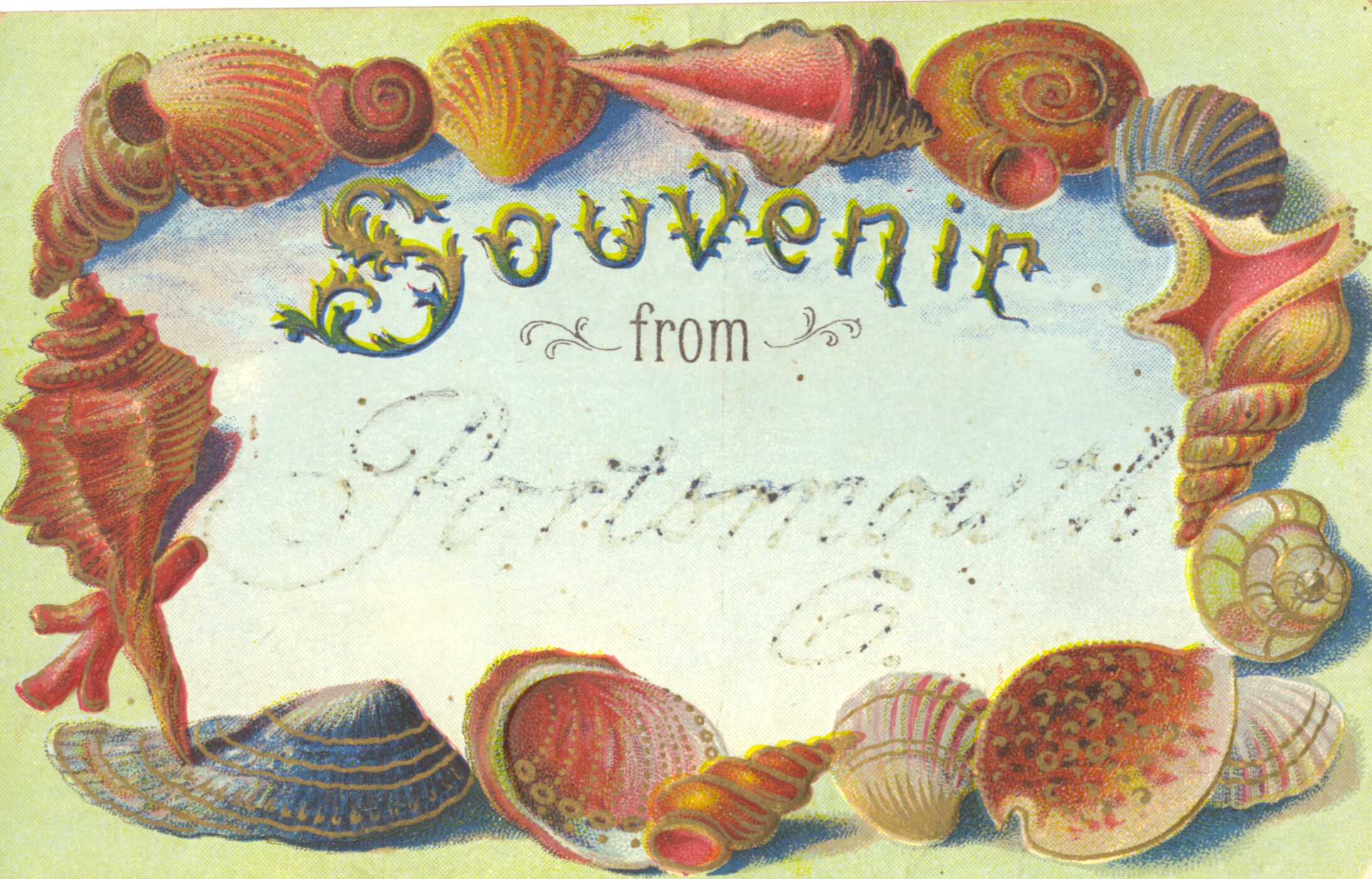 - Surrounded by a border of seashells: "Souvenir from Portsmouth, O."