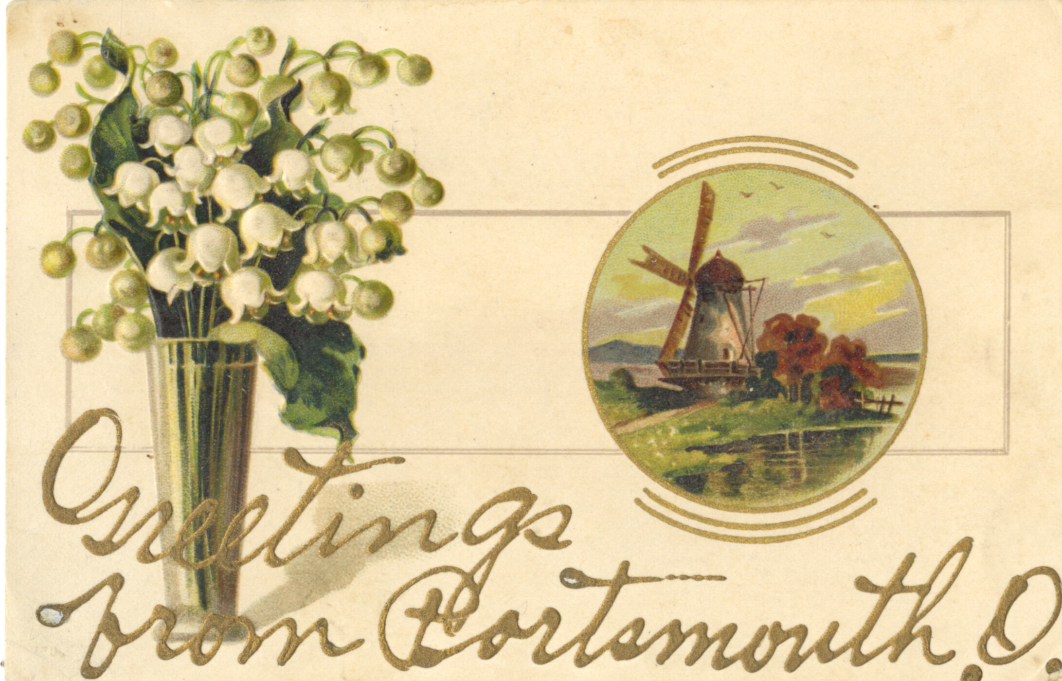 - "Greetings From Portsmouth, O." written in gold cursive script. A vase of white flowers is behind it on the left and on the right is a circular image of a windmill and flowers done in water color.