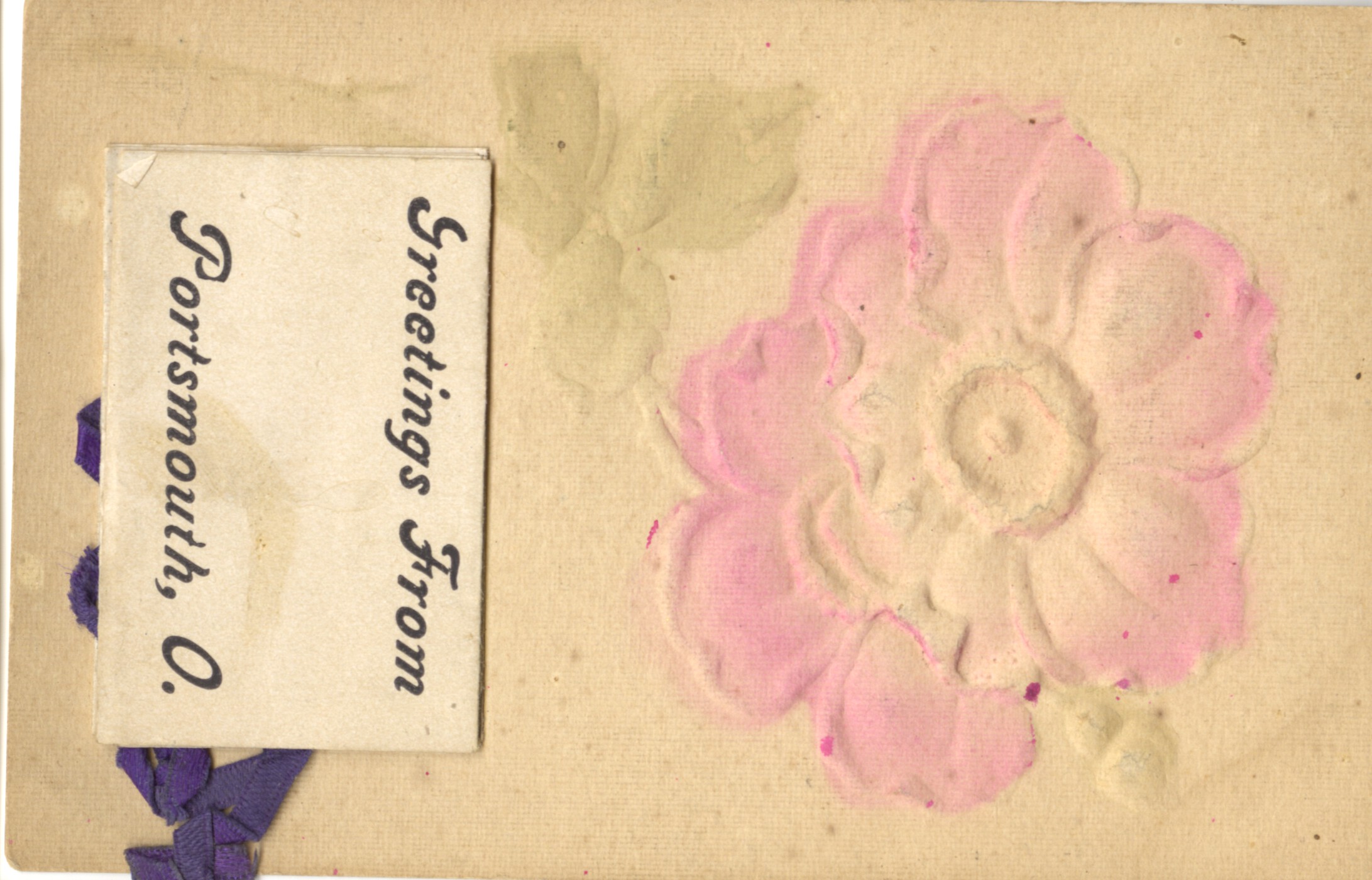 - "Greetings From Portsmouth, O," typed under a faded embossed pink flower.