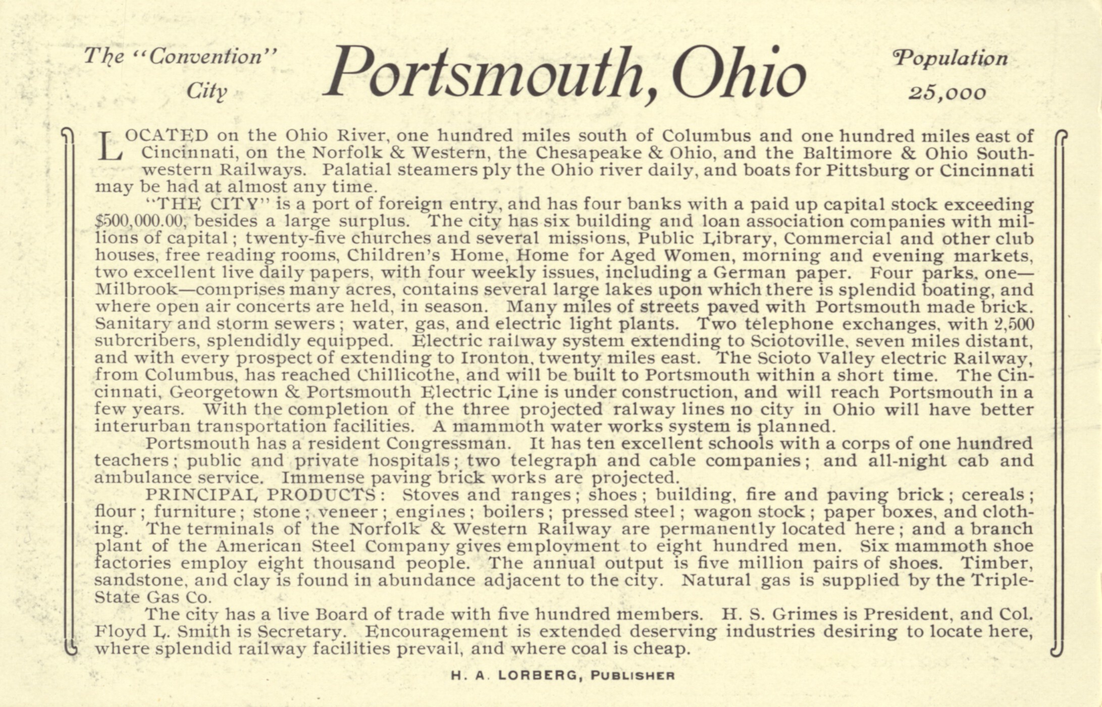 Published by H. A. Lorberg, “The Convention City: Portsmouth Ohio,” Scioto County Public Library Local History Digital Collection, accessed December 9, 2025, https://www.sciotolibrary.org/history/items/show/18701.