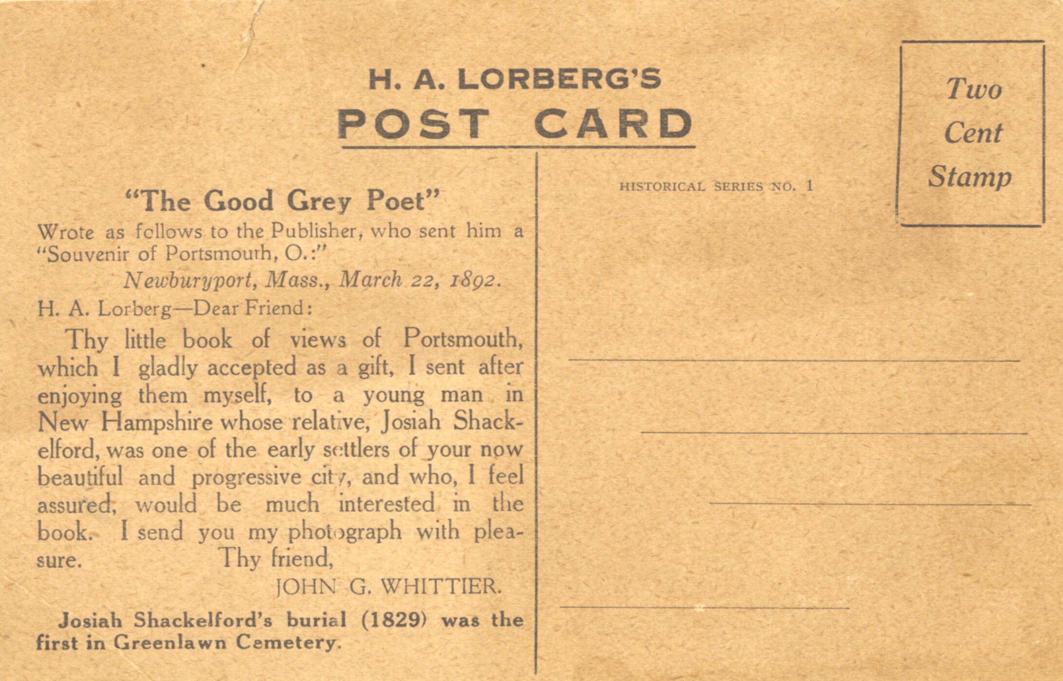 Historical note on the back about the first person buried in Greenlawn Cemetery, Josiah Shackelford (1829). - Creator