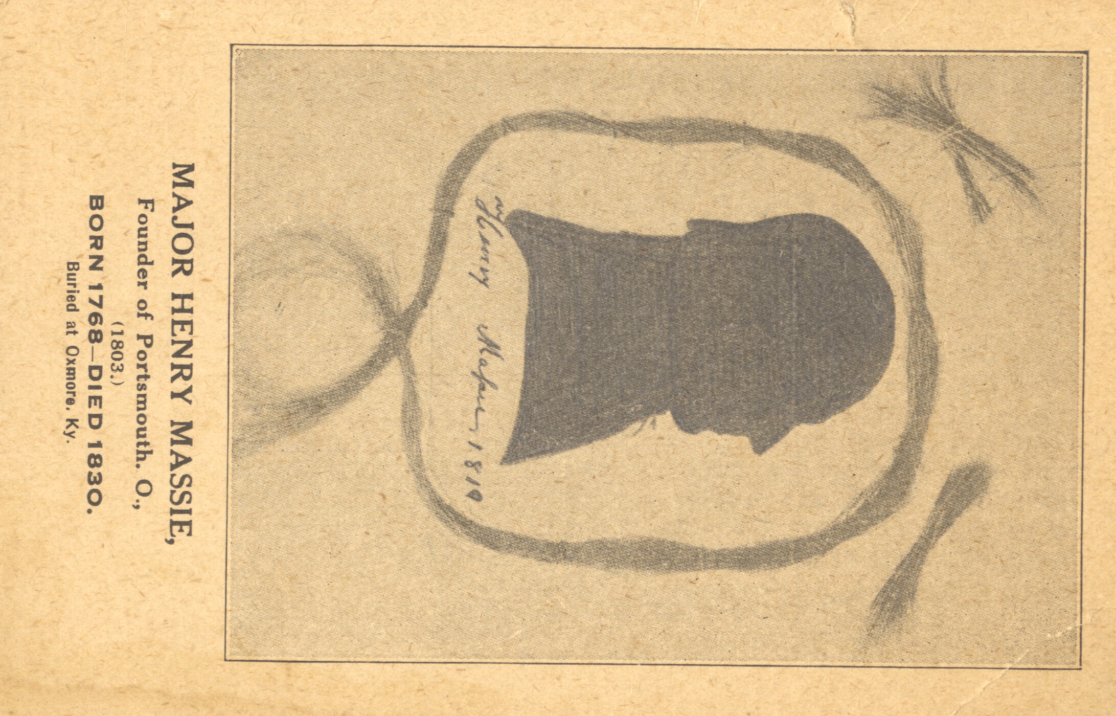 - Major Henry Massie: Credited founder of Portsmouth, Ohio. Born 1768, died 1830. Buried at Oxmore, Kentucky.