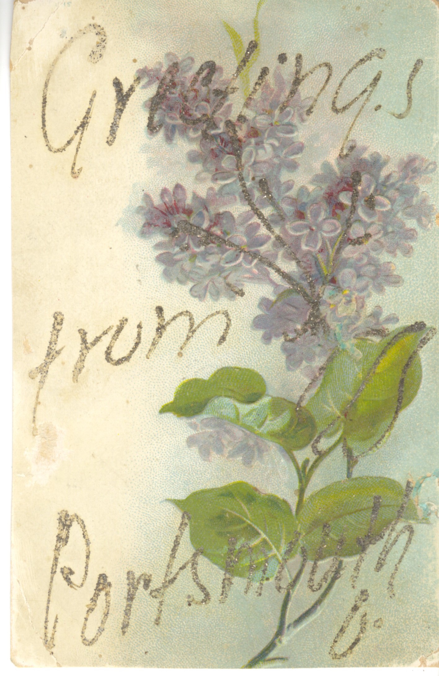 - "Greetings From Portsmouth, O." written in silver script with a purple flower in the background.