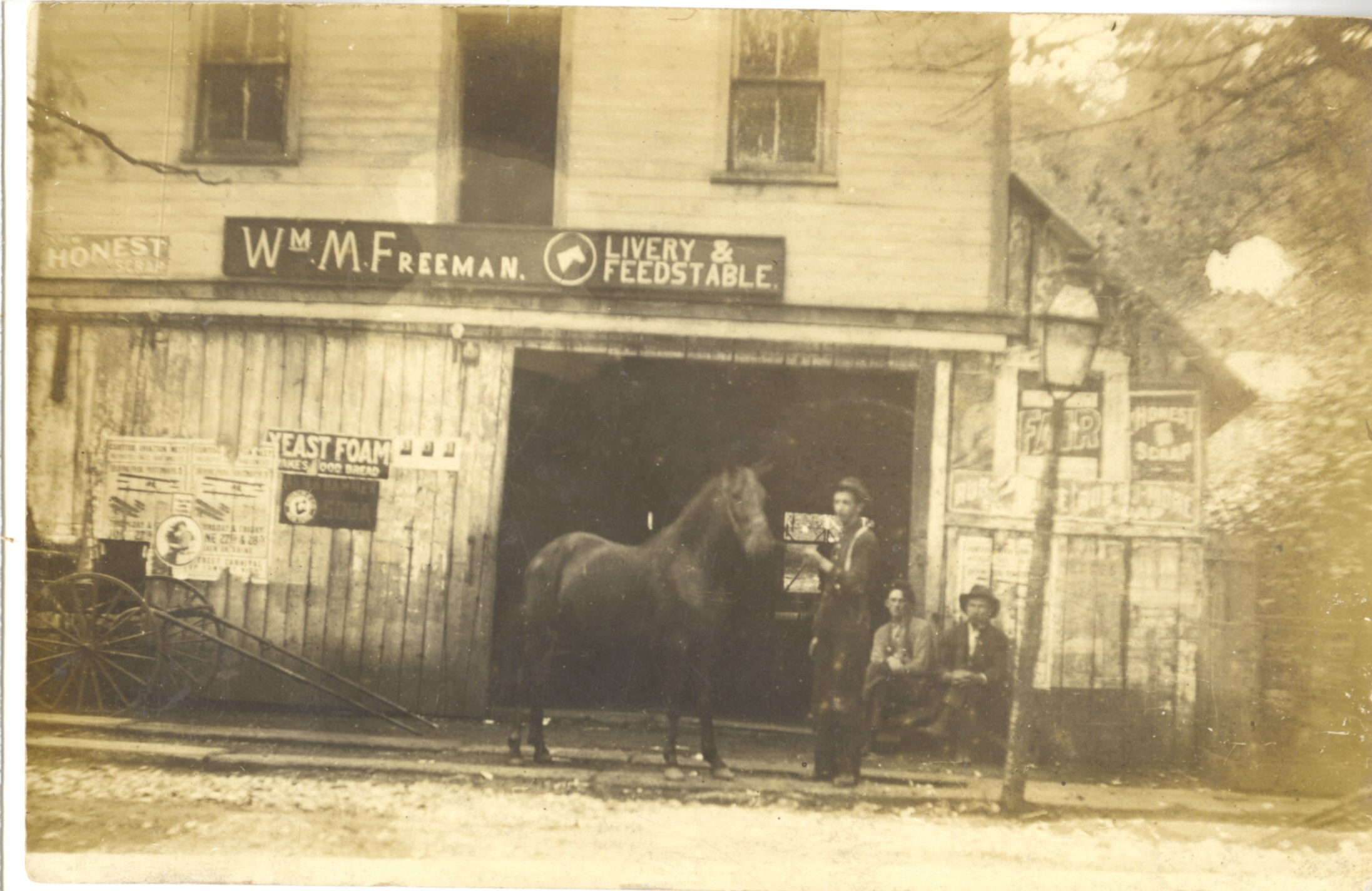 - Black and white photo image of Wm M Freeman Livery and Feedstable.