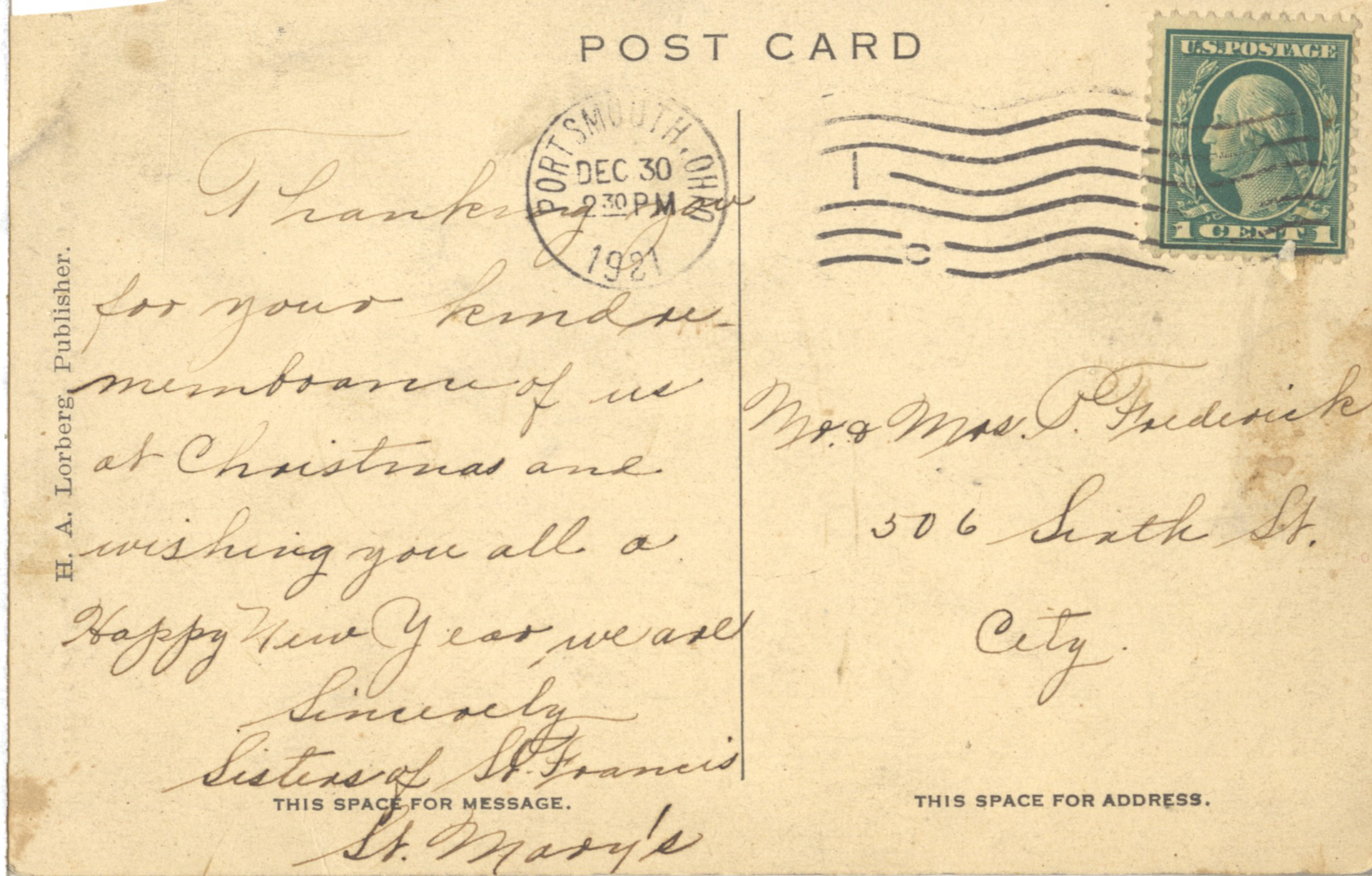 H. A. Lorberg, “Home of St. Francis Sisters of St. Mary's School, Portsmouth, Ohio,” Scioto County Public Library Local History Digital Collection, accessed December 14, 2025, https://www.sciotolibrary.org/history/items/show/18861.