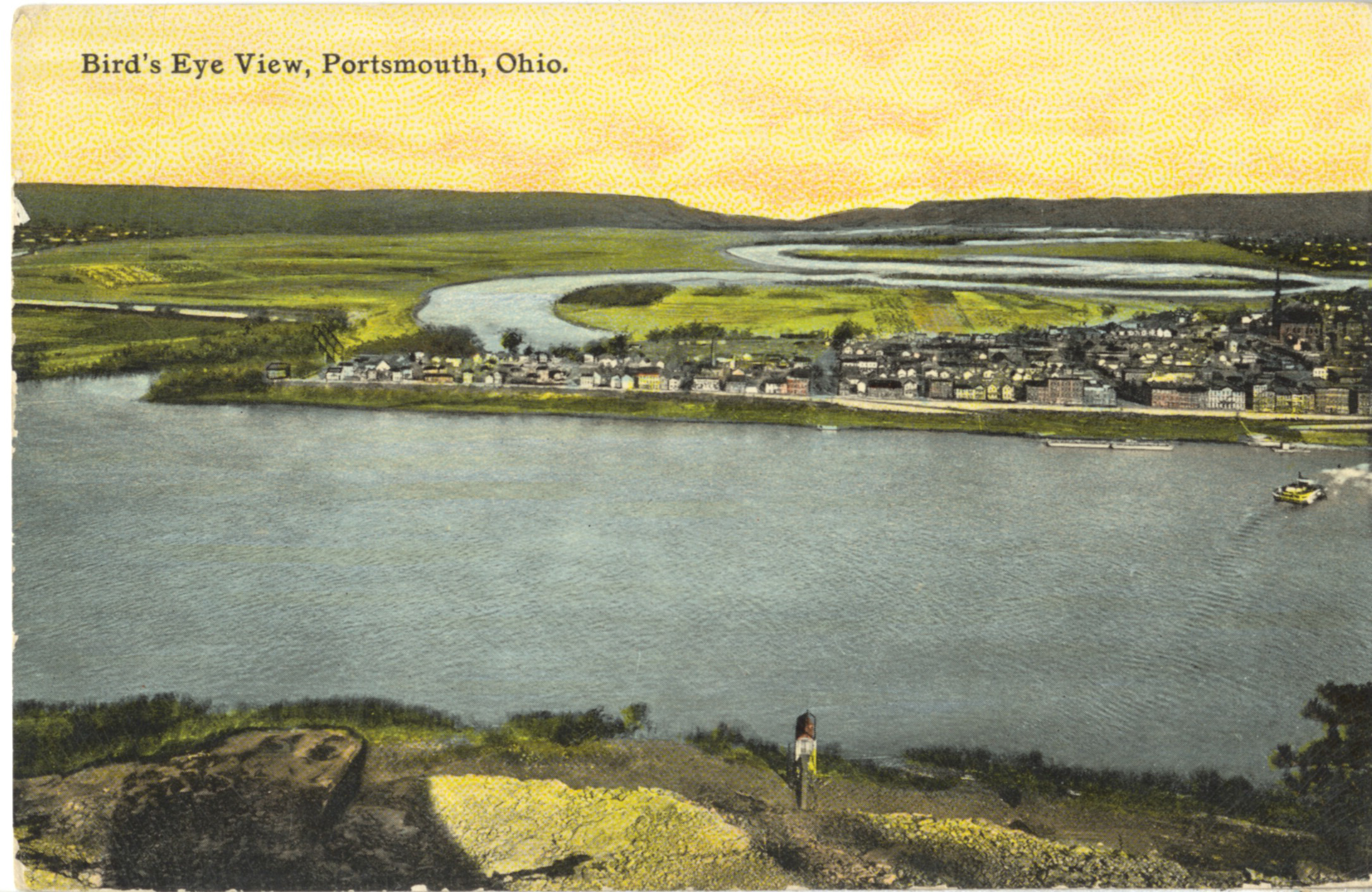 - Colorized image of a bird's eye view of Portsmouth from Kentucky across the Ohio River.