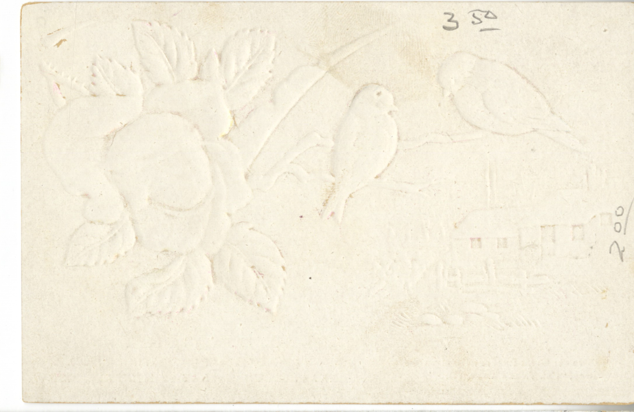 - Colorized image of two blue and russet birds perched on branches with a farm scene below them. The card says "Compliments of the Mill Store located at the corner of Fourth (4th) and Chillicothe Streets." The Mill Store was a dry goods store.