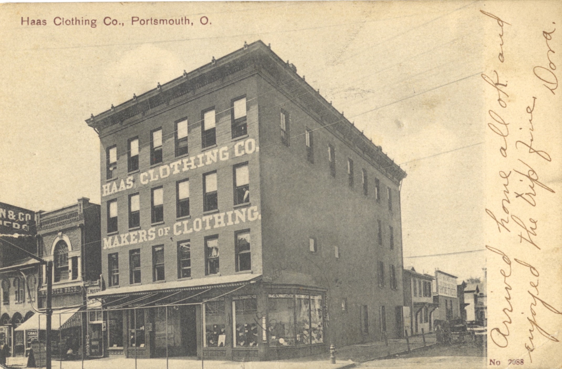 H. A. Lorberg, Publisher, Portsmouth, Ohio and Leipzig, Germany, “Haas Clothing Co., Portsmouth, Ohio,” Scioto County Public Library Local History Digital Collection, accessed December 14, 2025, https://www.sciotolibrary.org/history/items/show/19189.