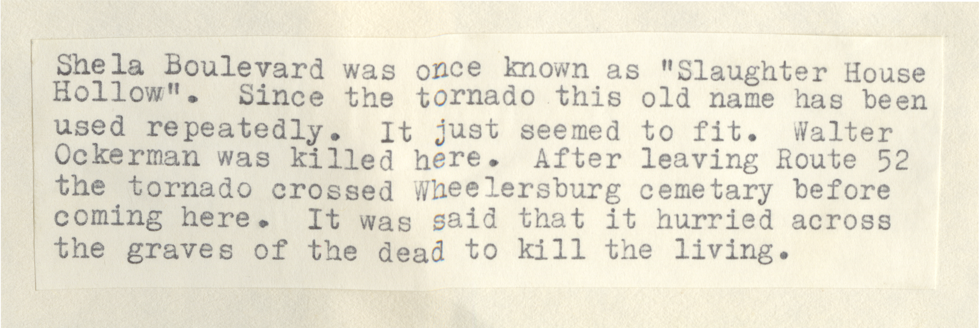 - scanned image of typewritten notation in scrapbook about Shela Boulevard. Name was derived from a slaughter house that existed on the road.
