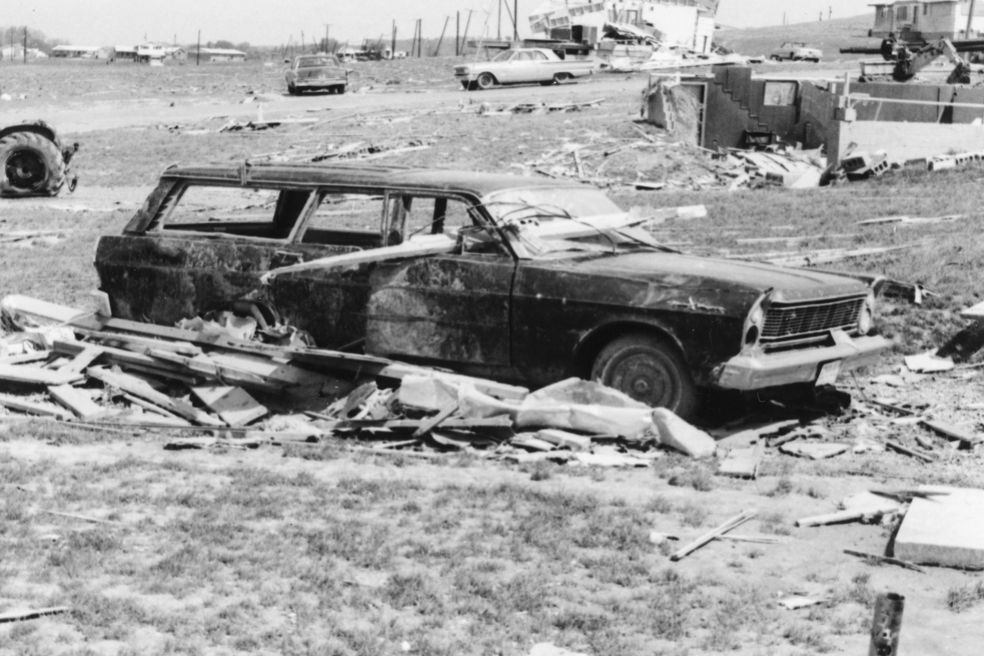 - Black and white photo image of a destroyed car with a large wooden plank through windows in the area of Ed Pyle's addition on Ridgewood Drive