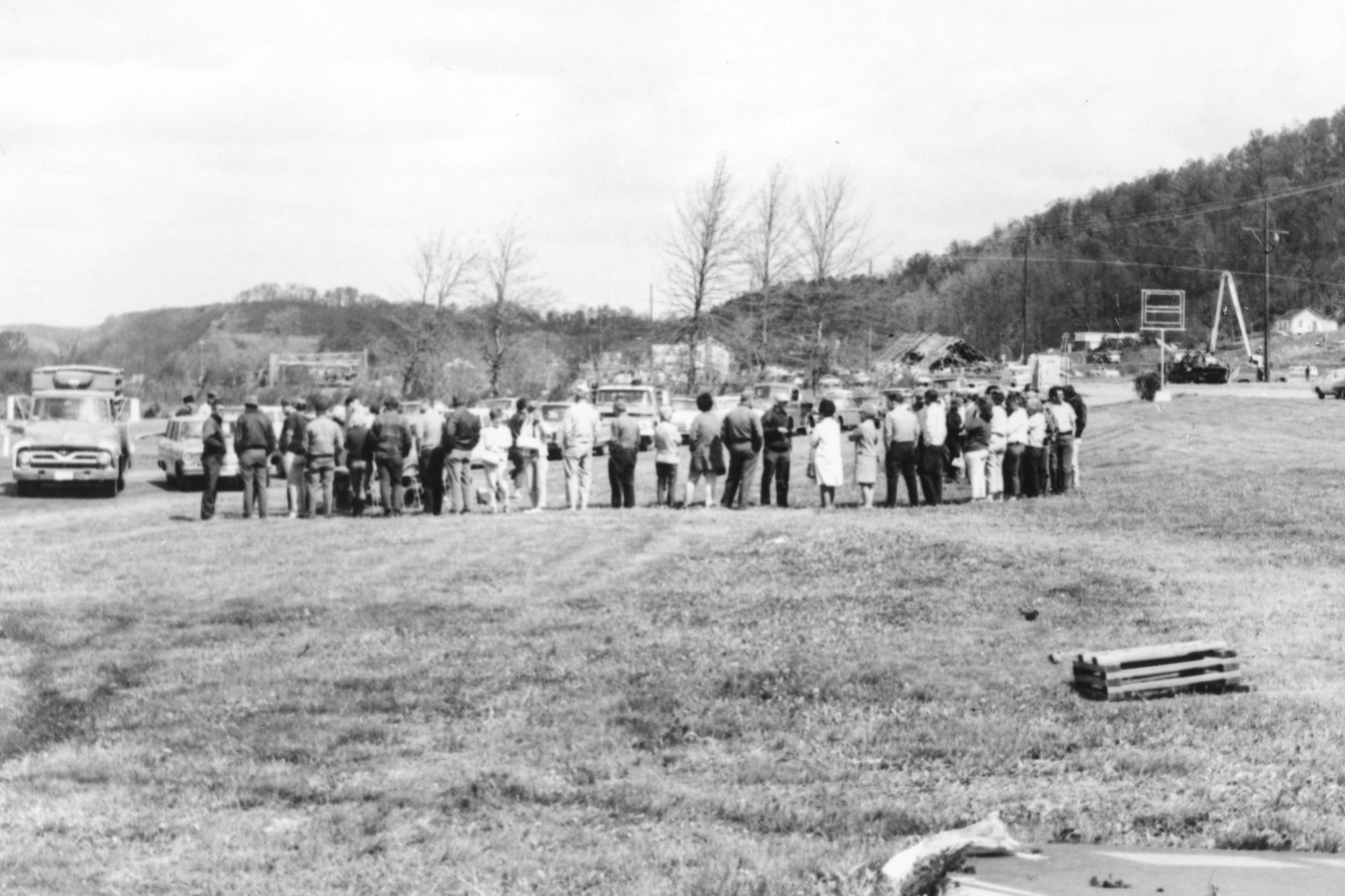 - Black and white photo image of a crowd of people in the field across from the Drive-In.