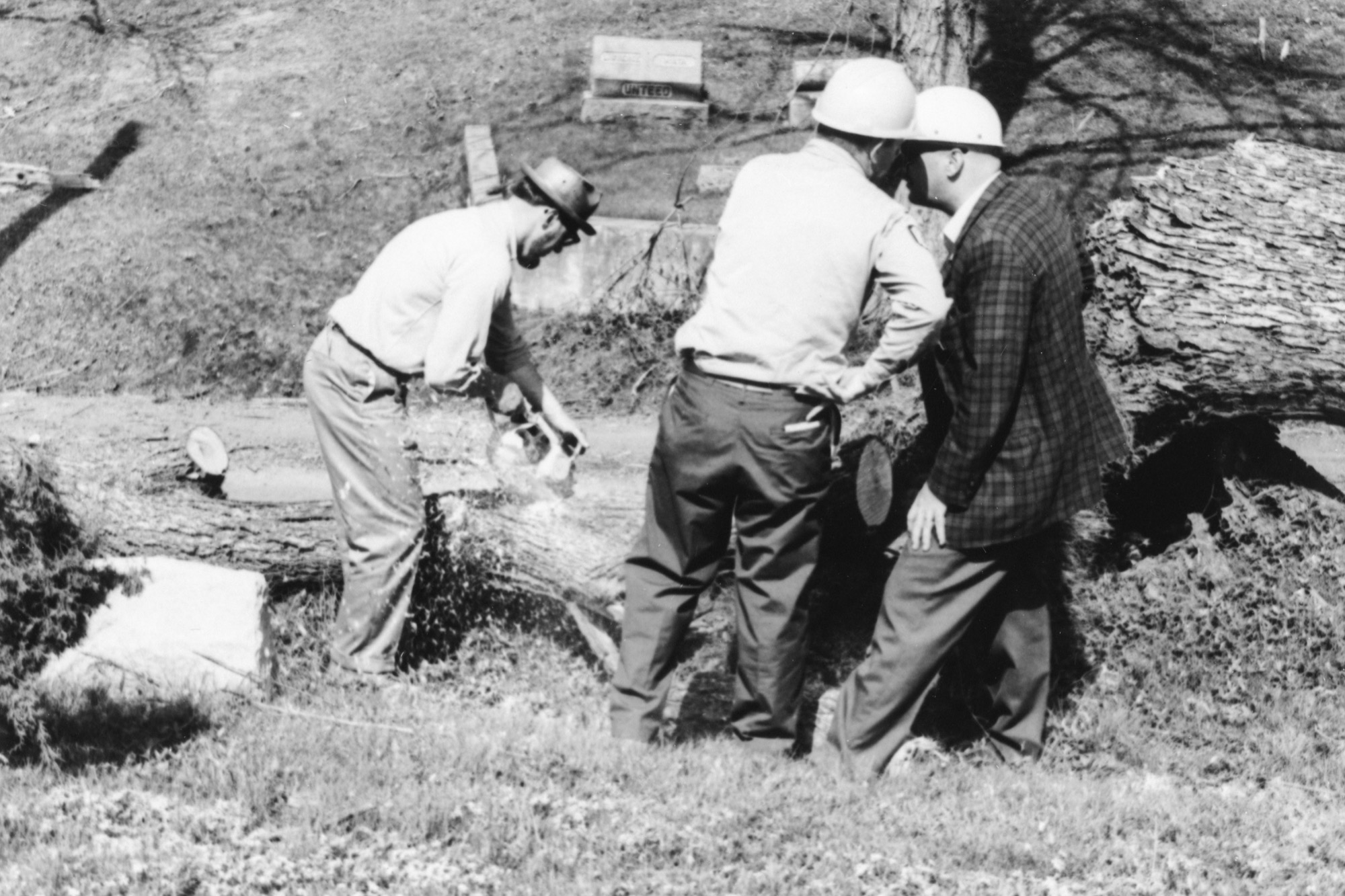 - Black and white photo image of some Ohio Civil Defense workers and volunteers clearing away debris and broken trees at the Old Wheelersburg Cemetery.
