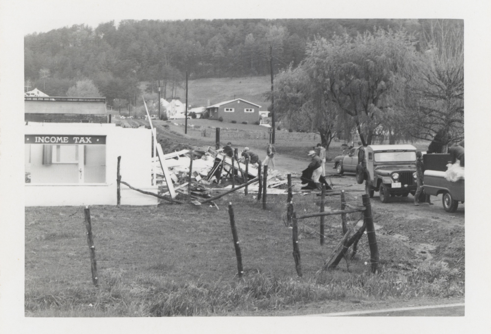 - Black and white photo image of wind damage in Lucasville after the Wheelersburg tornado