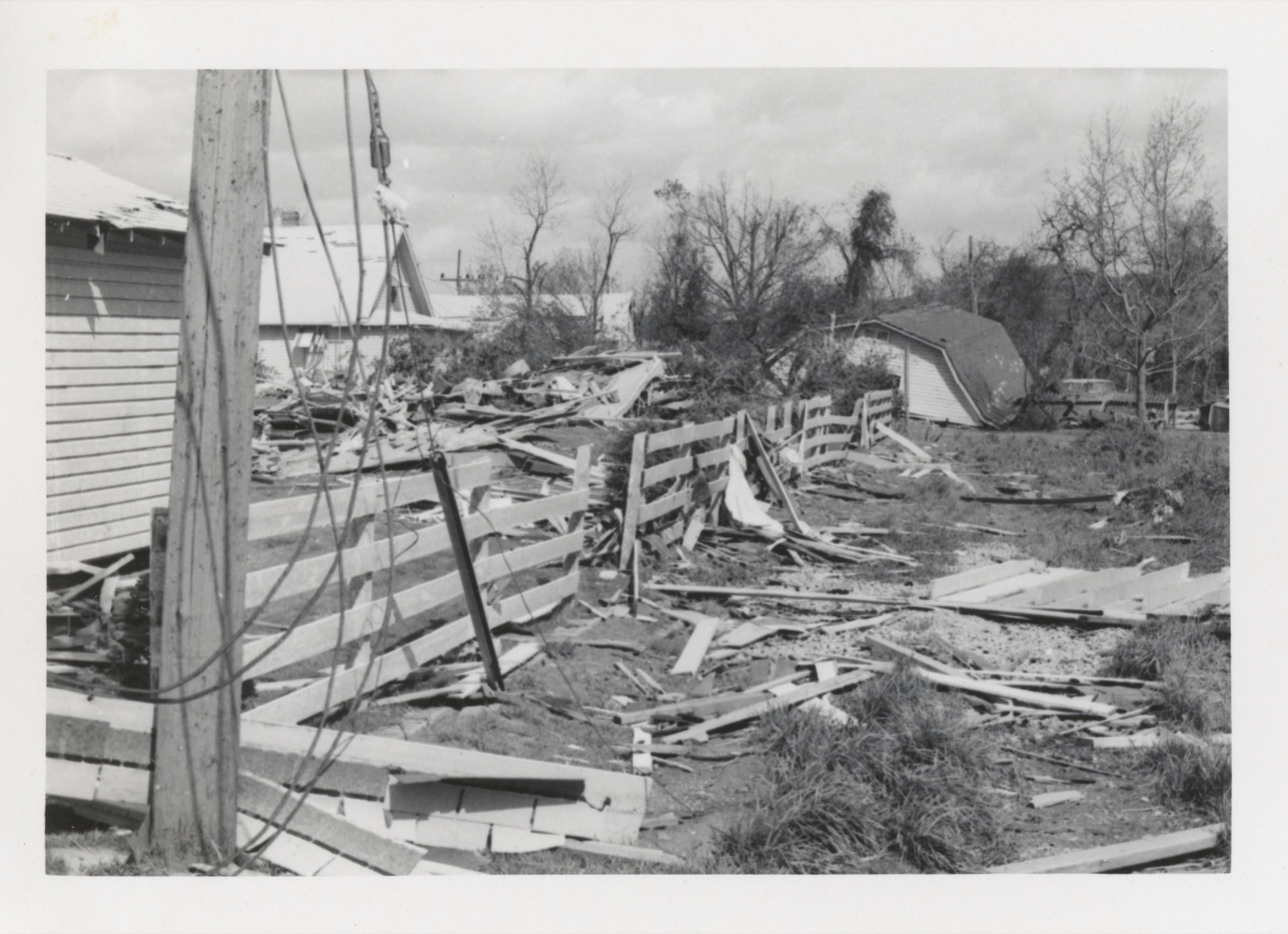- Black and white photo image of the destruction of the tornado in the Dogwood Ridge area in Wheelersburg