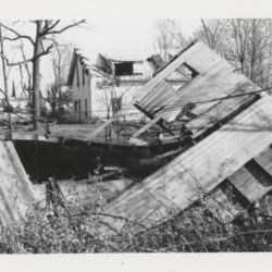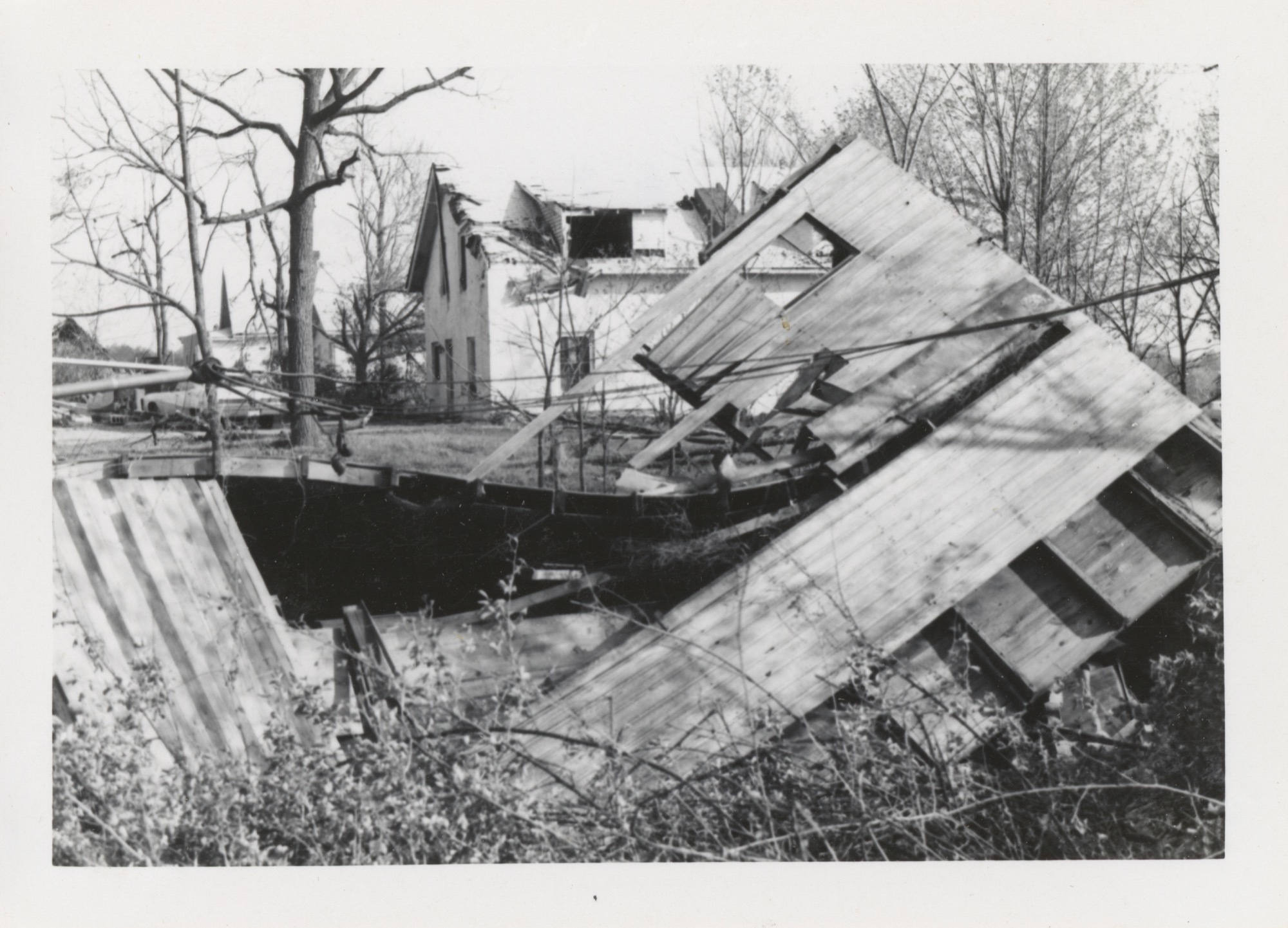 - Black and white photo image of the destruction caused by the tornado in Wheelersburg