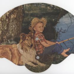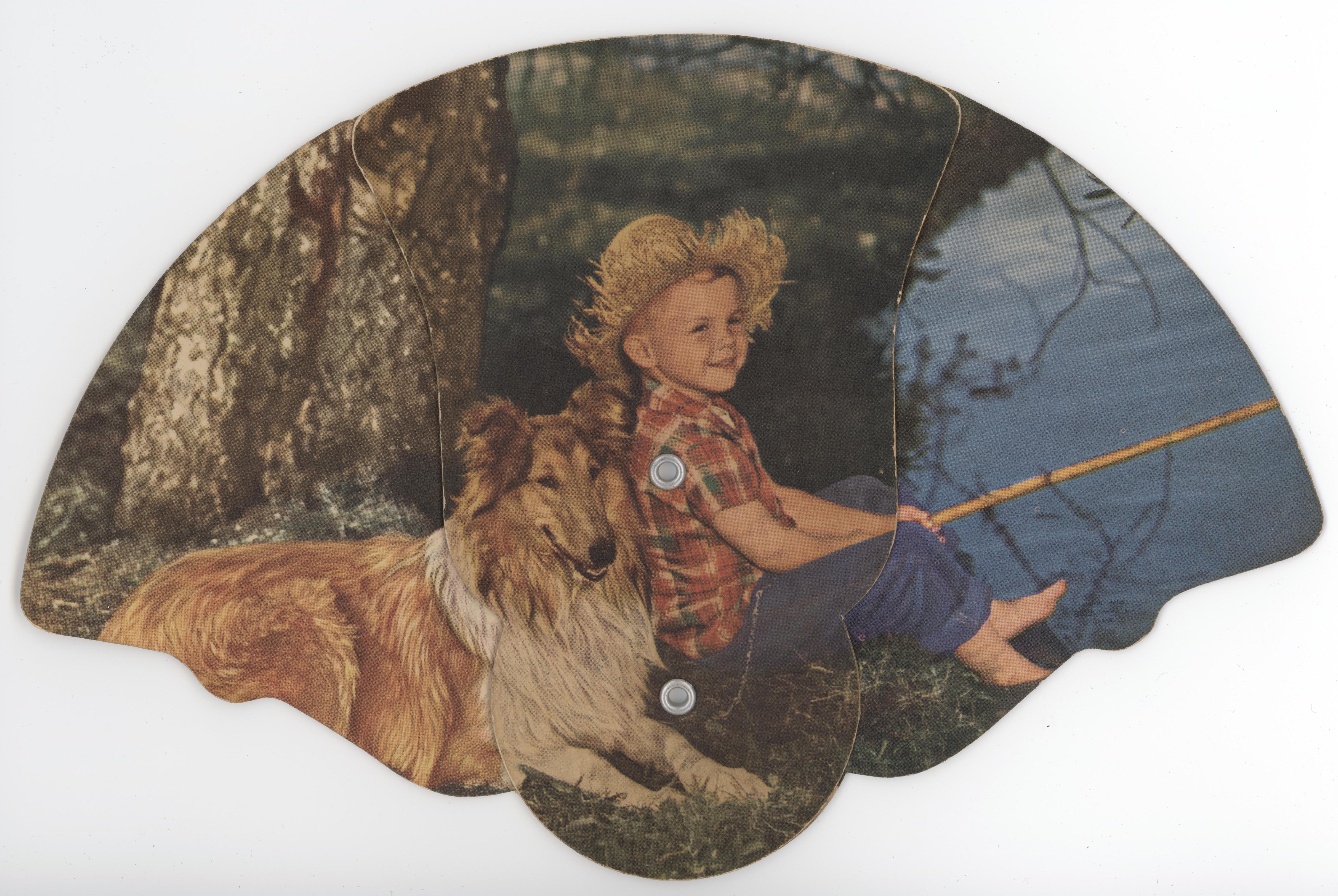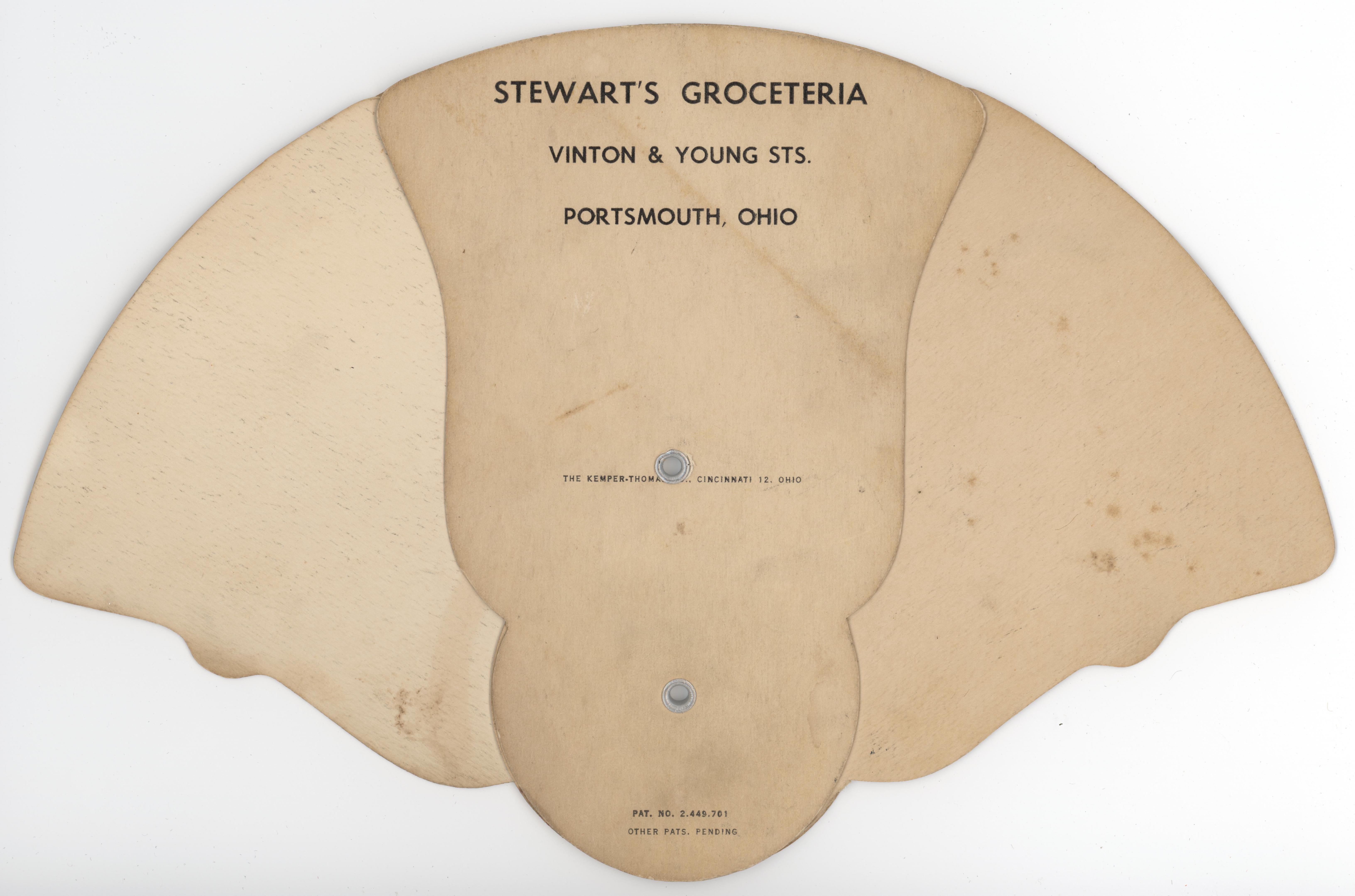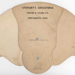 - Color folding board fan with boy and dog on front. "Stewart's Groceteria, Vinton & Young Streets, Portsmouth, Ohio" on back.