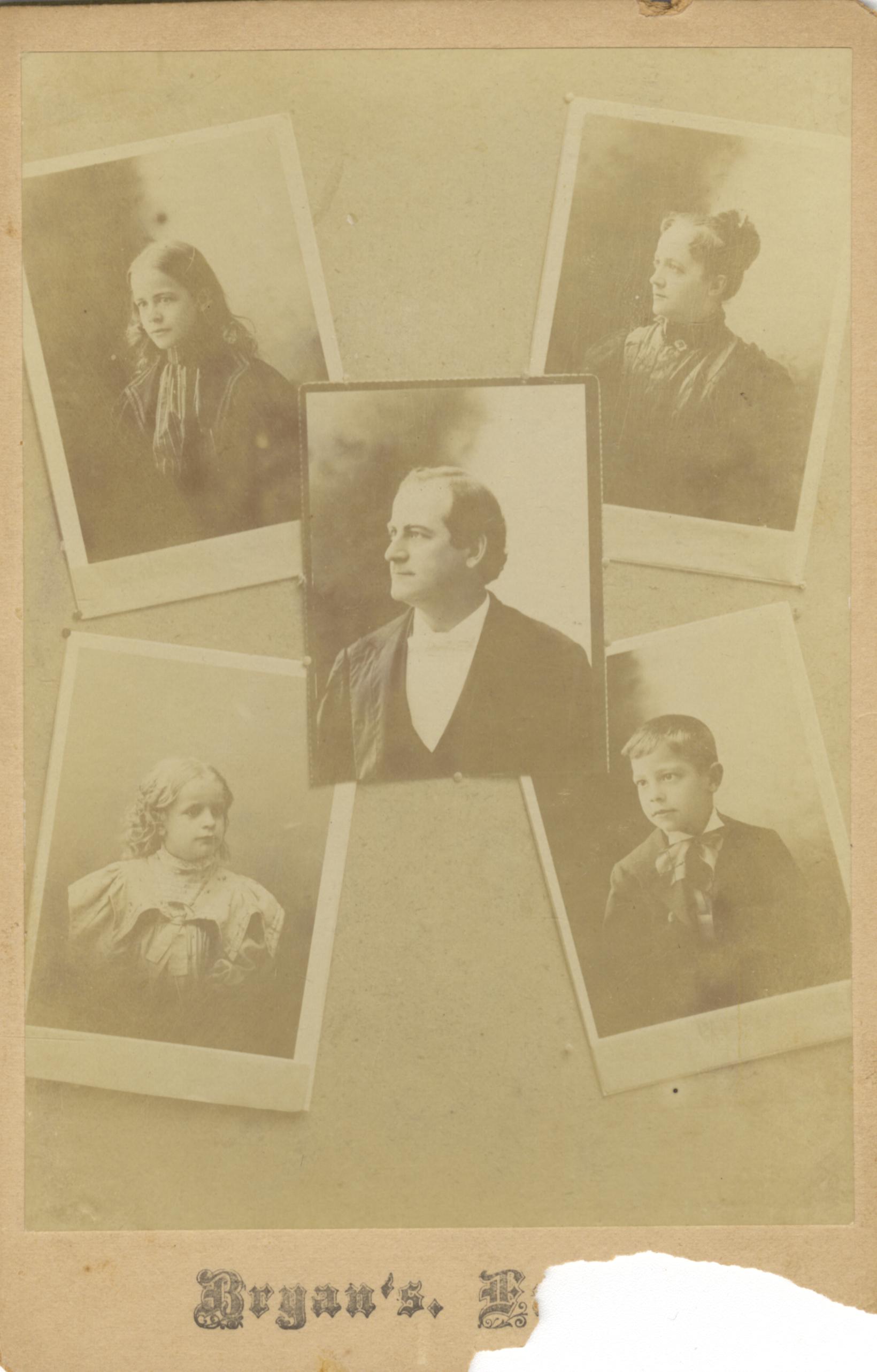 - Sepia toned photo image of various members of the Buchanan family in five small photographs on a cabinet card. The bottom right corner has been torn off.