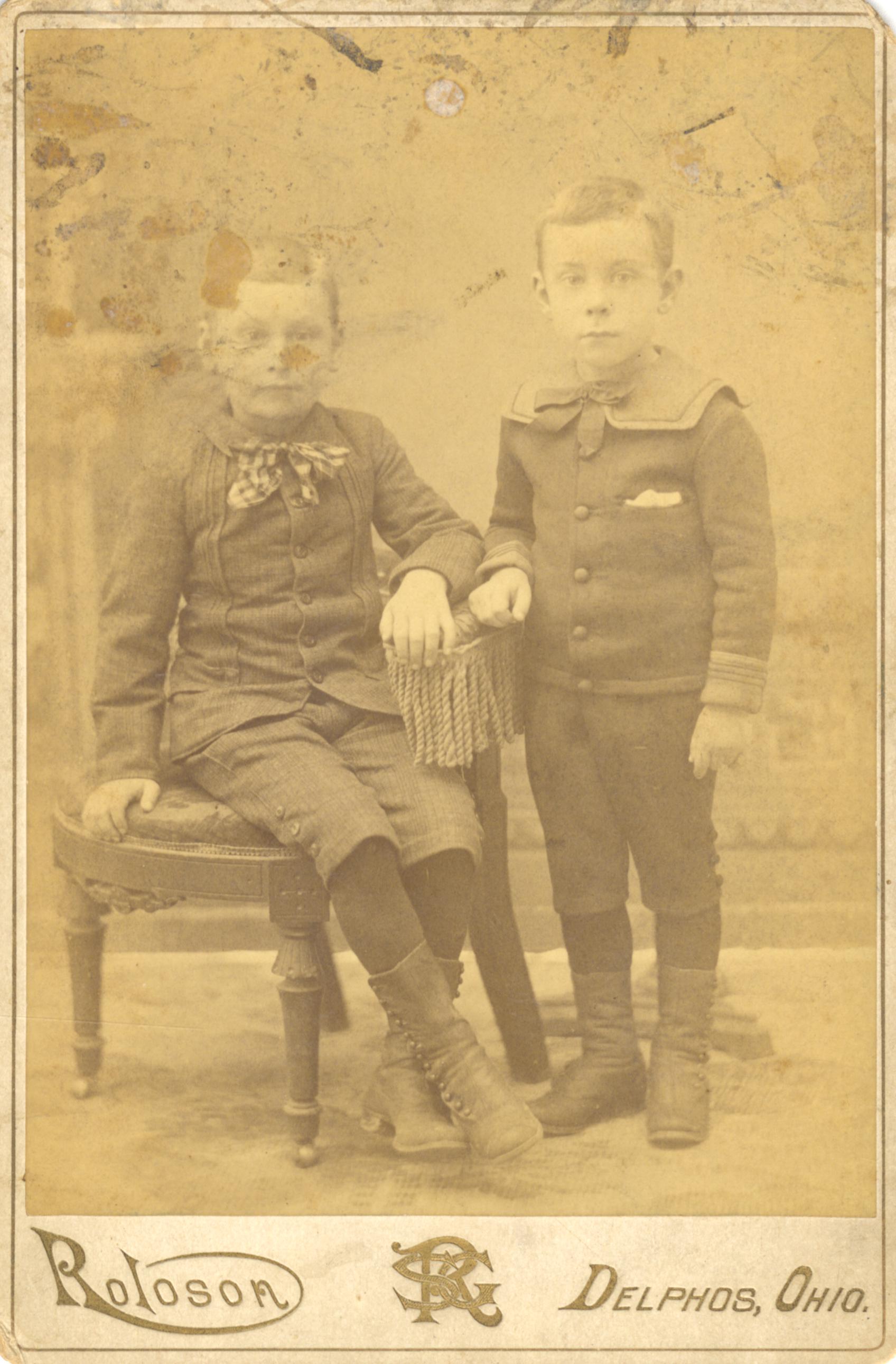 - Sepia tone photo image of two boys, Clarence and Johny Grippe, posing for a photograph with a chair.