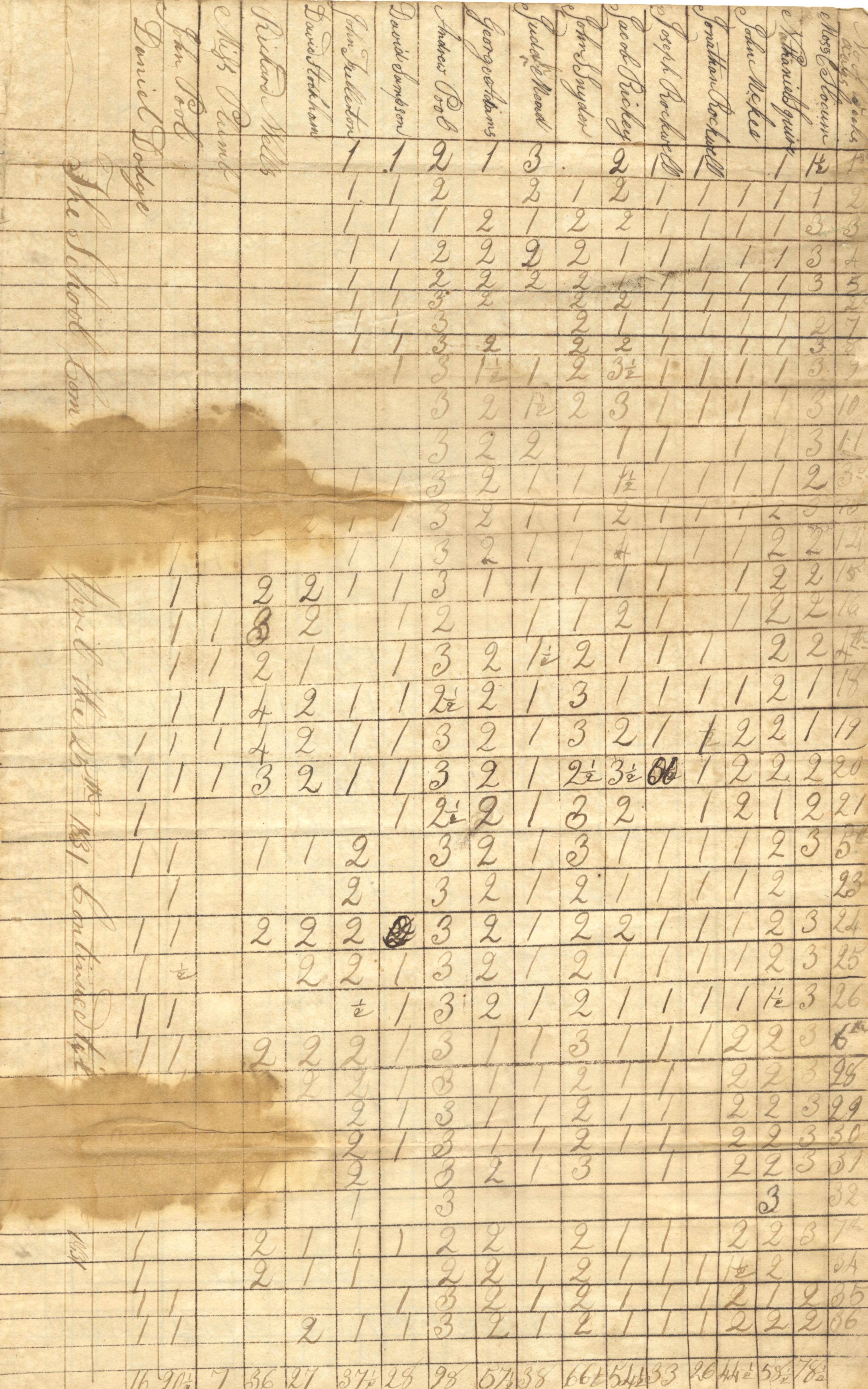- Eight loose pages from a log indicating an agreement between Scioto County and David Sekes as an instructor/ teacher. Aged documents are front and back with students names in Vernon and Madison Townships. Some holes due to past insect activity.