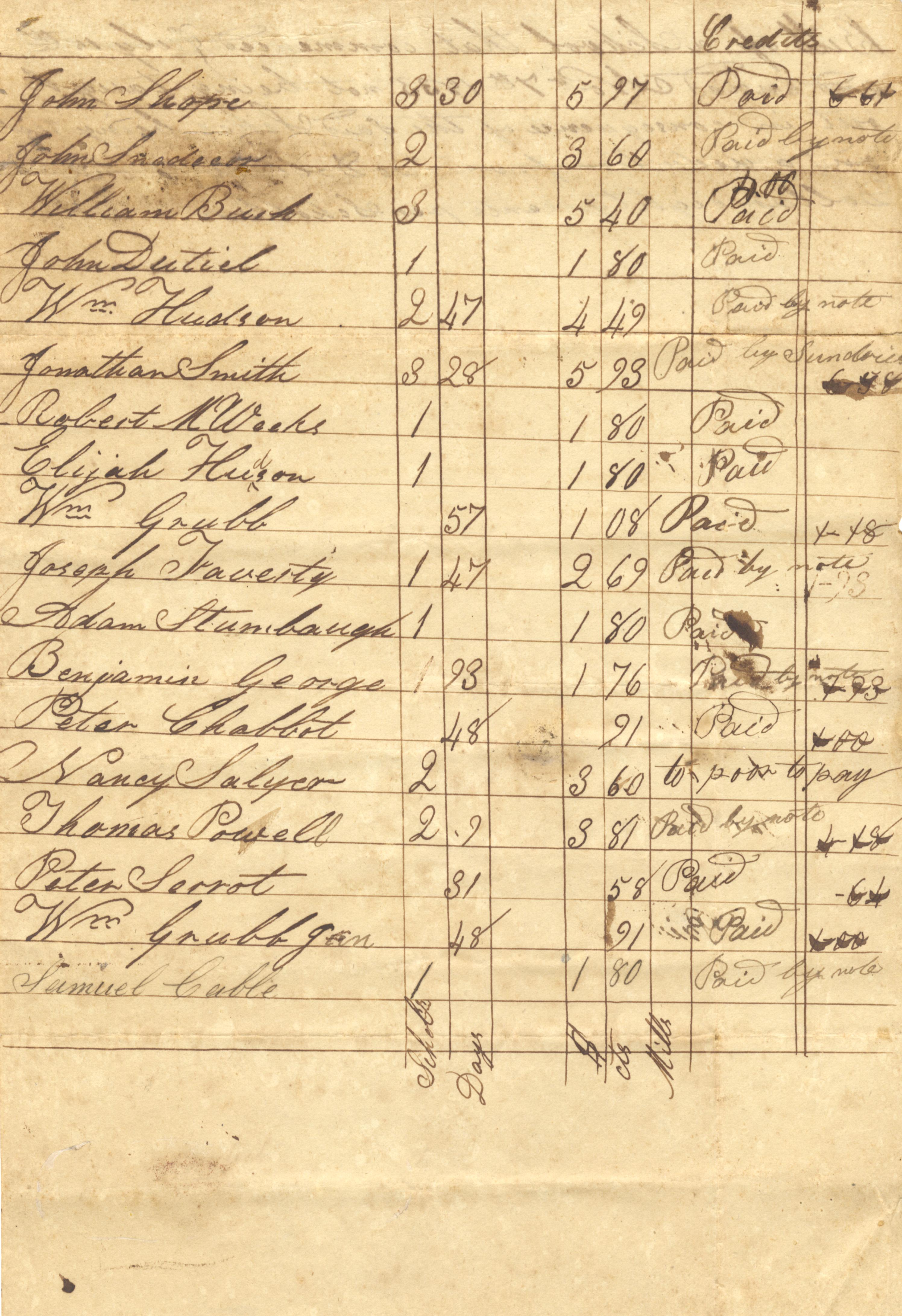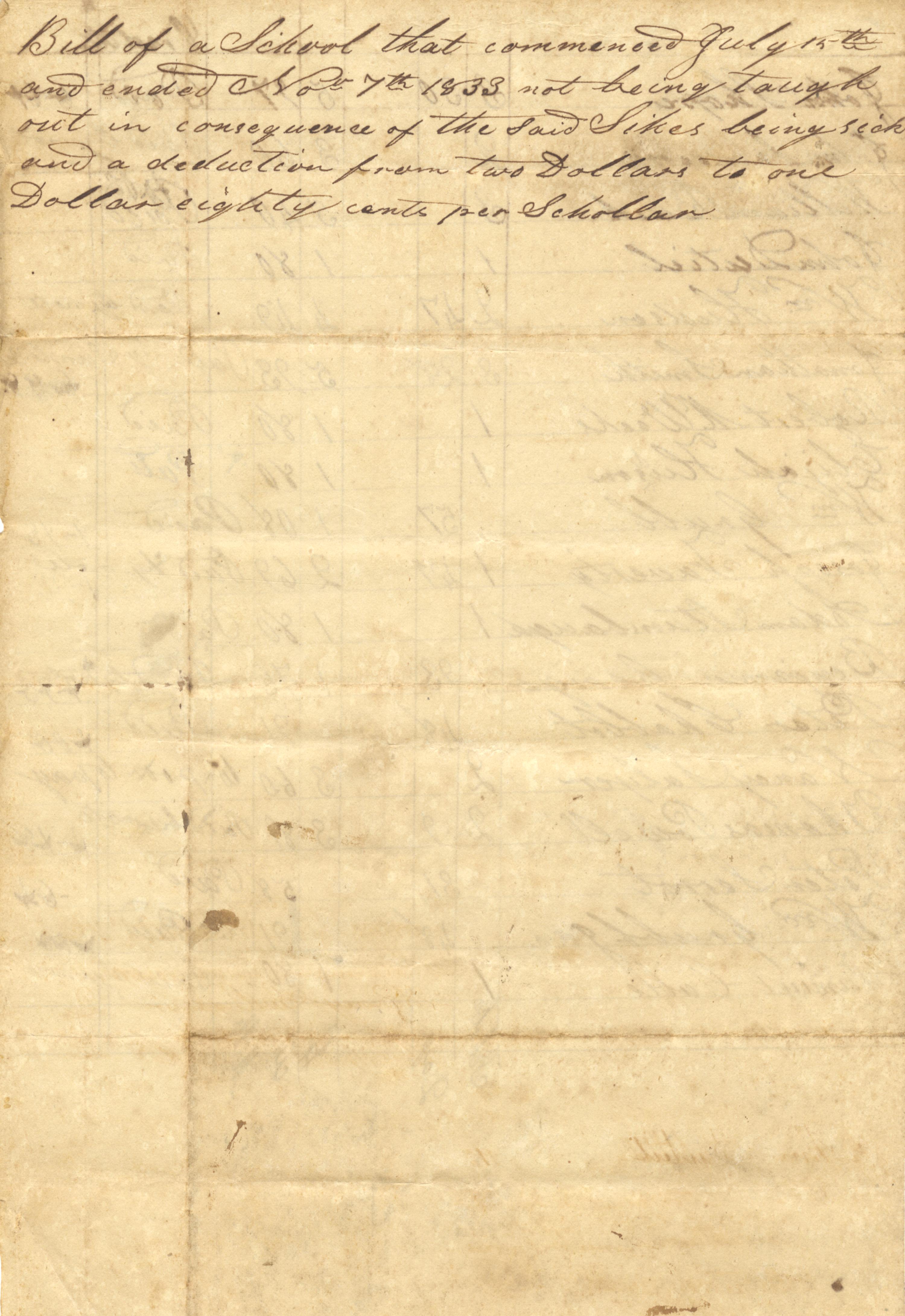 - Eight loose pages from a log indicating an agreement between Scioto County and David Sekes as an instructor/ teacher. Aged documents are front and back with students names in Vernon and Madison Townships. Some holes due to past insect activity.