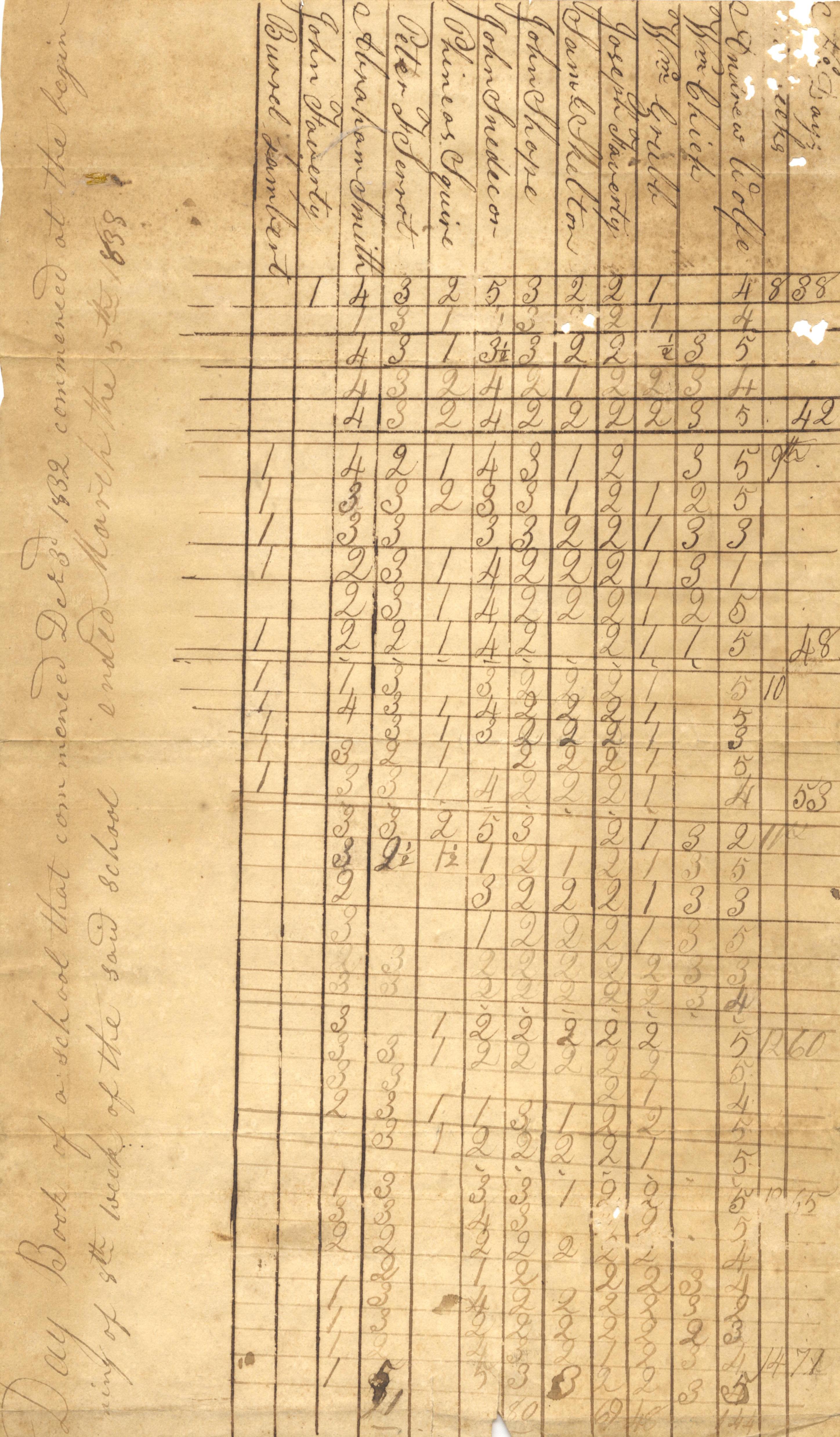 - Eight loose pages from a log indicating an agreement between Scioto County and David Sekes as an instructor/ teacher. Aged documents are front and back with students names in Vernon and Madison Townships. Some holes due to past insect activity.