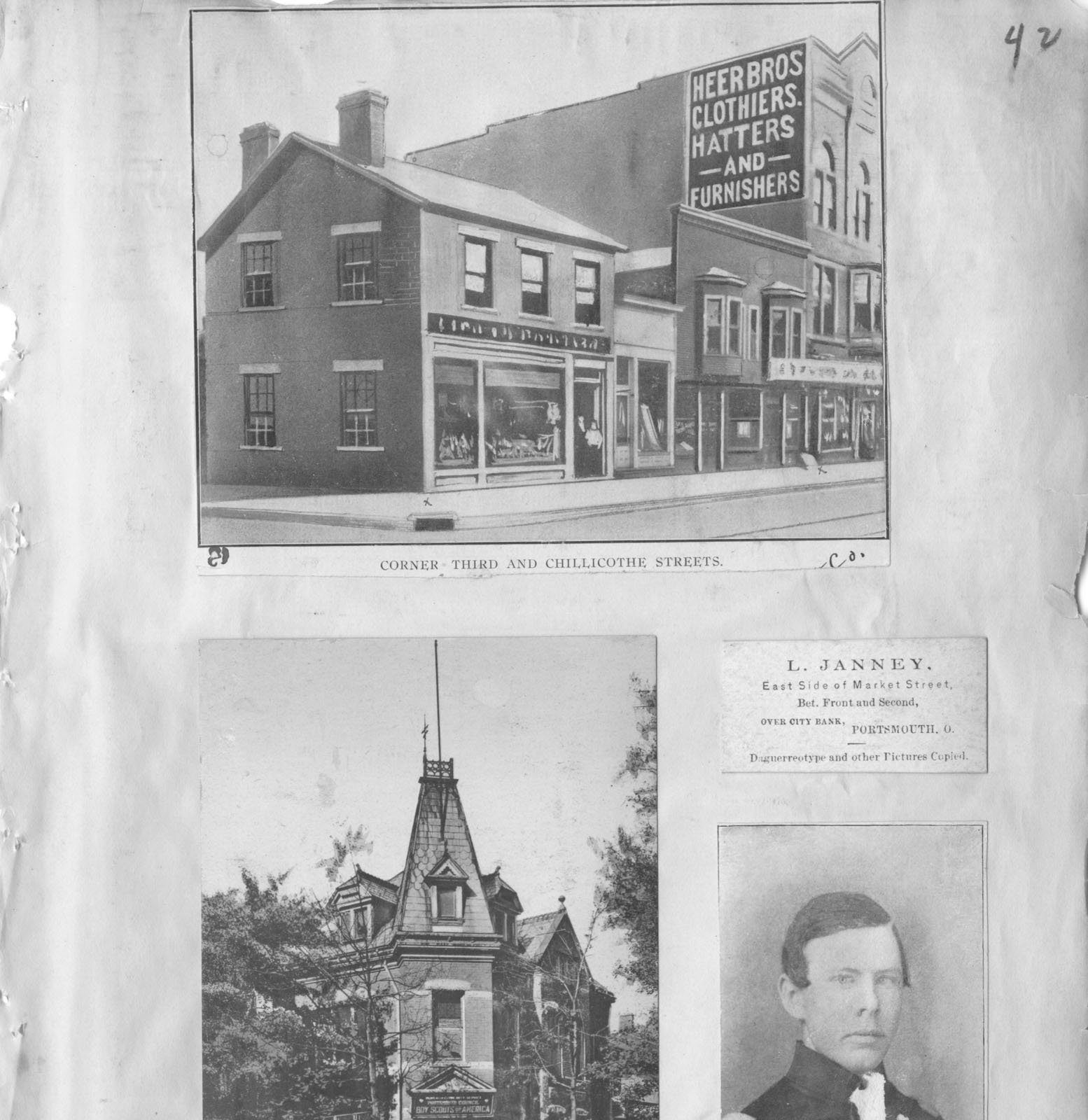 - Scanned page 42 from Henry A. Lorberg scrapbook containing black & white image of the corner of Third (3rd) and Chillicothe Streets showing the Heer Bros sign; a building with a sign that reads Portsmouth Council Boy Scouts of America; an unknown man; and a card for L. Janney.