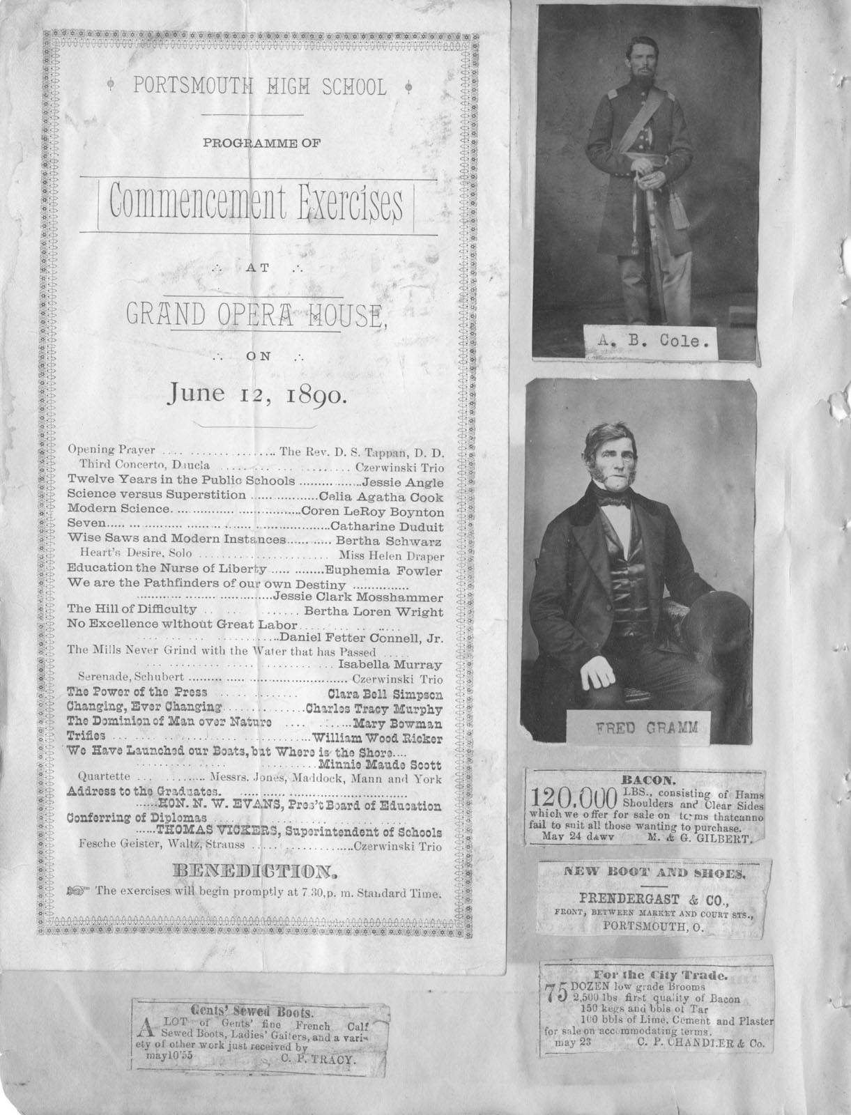 - Scanned unnumbered page from Henry A. Lorberg scrapbook containing black & white program the 1890 Portsmouth High School Commencement Exercises at the Grand Opera house; photos of A.B. Cole and Fred Gramm; and cutouts of advertisements for C.P. Tracy's boots; M. & G. Gilbert's bacon; Prendergast & Co. Boots and shoes; C.P. Chandler & Co. assorted goods.