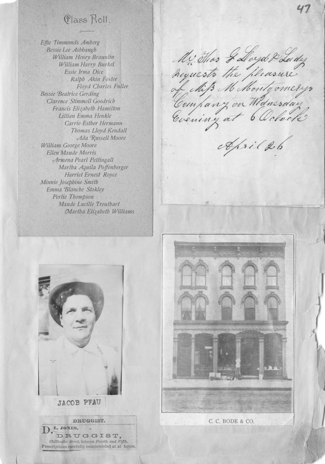 - Scanned page 47 from Henry A. Lorberg scrapbook containing a class roll from an unknown school and year; a handwritten note mentioning Mr. Thomas G. Lloyd and Lady; black & white image of Jacob Pfau; ad for D.L. Jones, Druggist; a black & white image of C.C. Bode & Co. (Salesroom on Gallia Street).