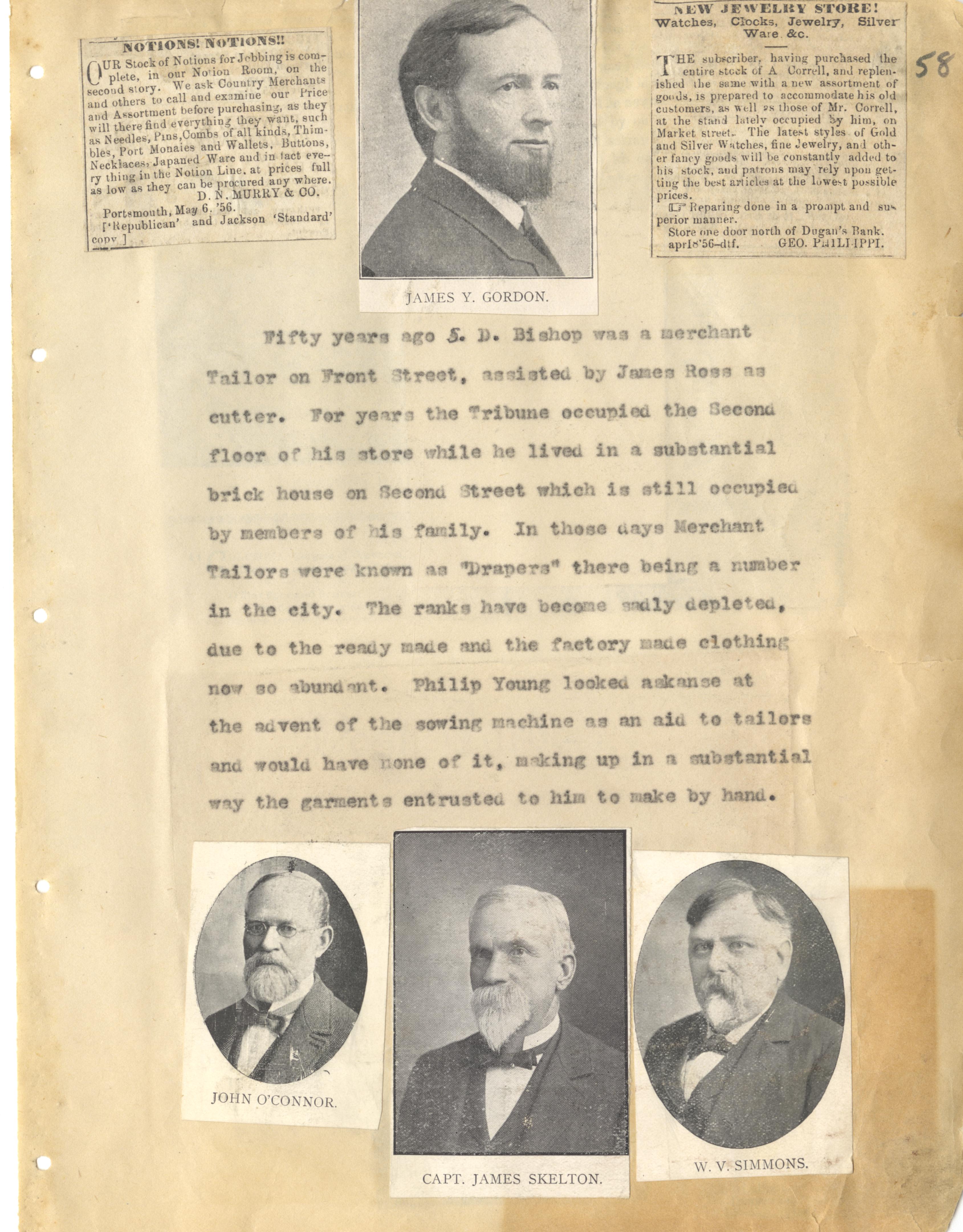 - Photo image of scanned scrapbook page: typed page giving details about a local merchant named S. D. Bishop and some history about Portsmouth merchants in general.