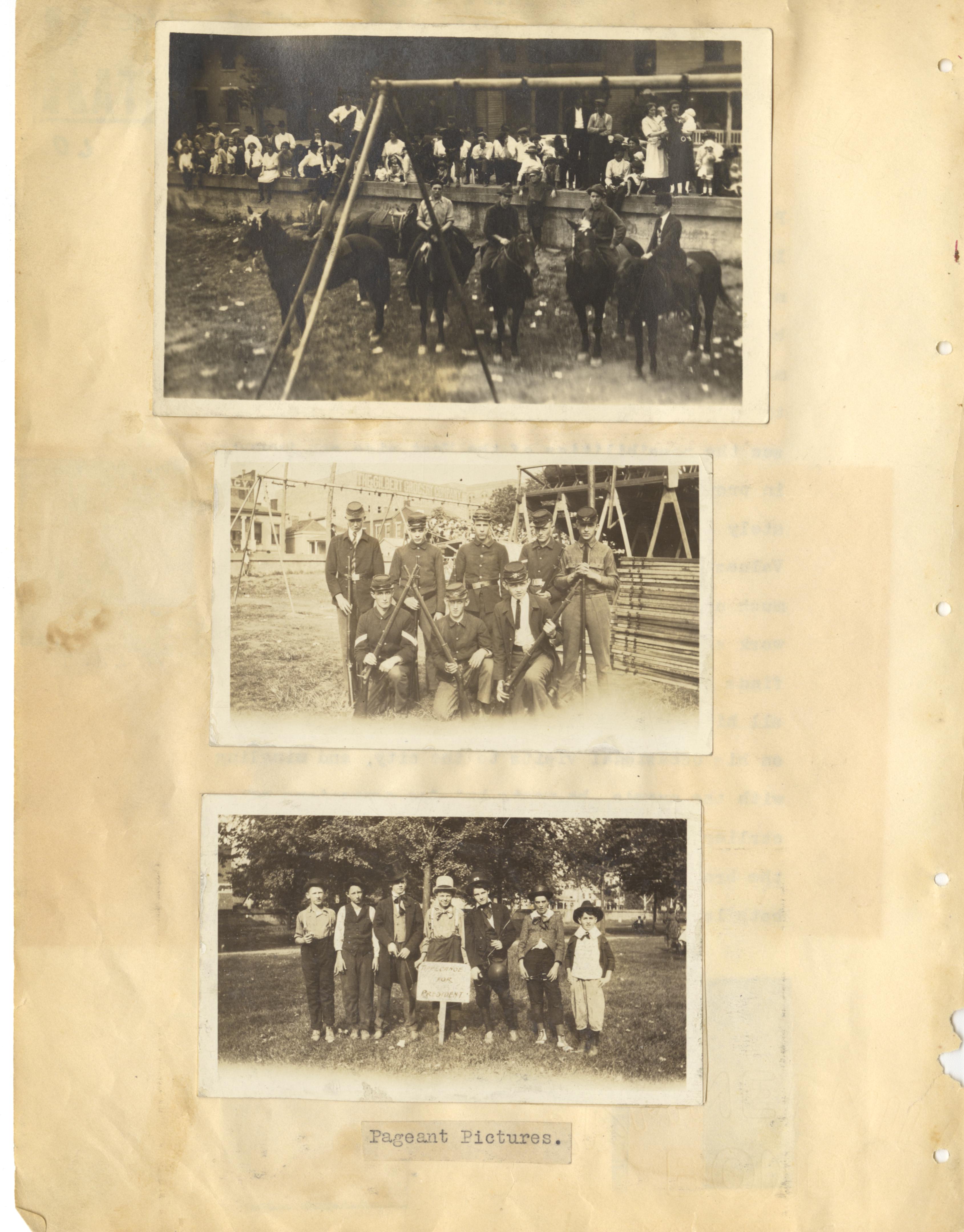 - Photo image of scanned scrapbook page: pictured are three pageant scenes: a horse show, boys in uniform, and more boys dressed in costumes with a sign that reads "Tippecanoe for President."